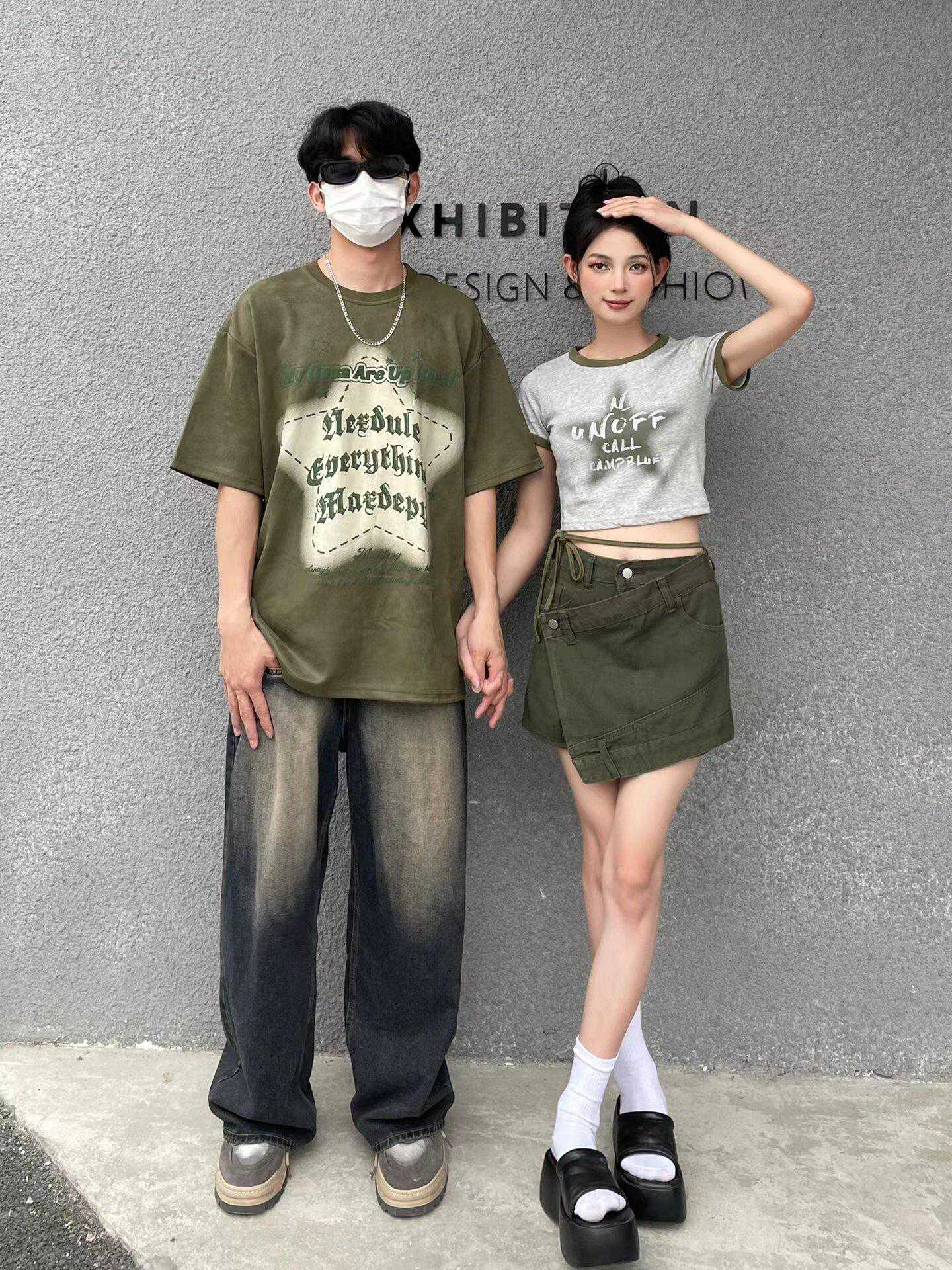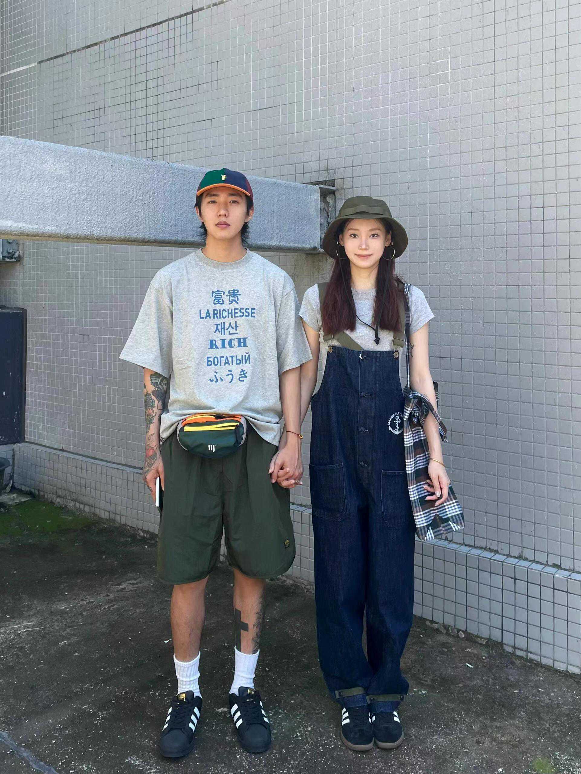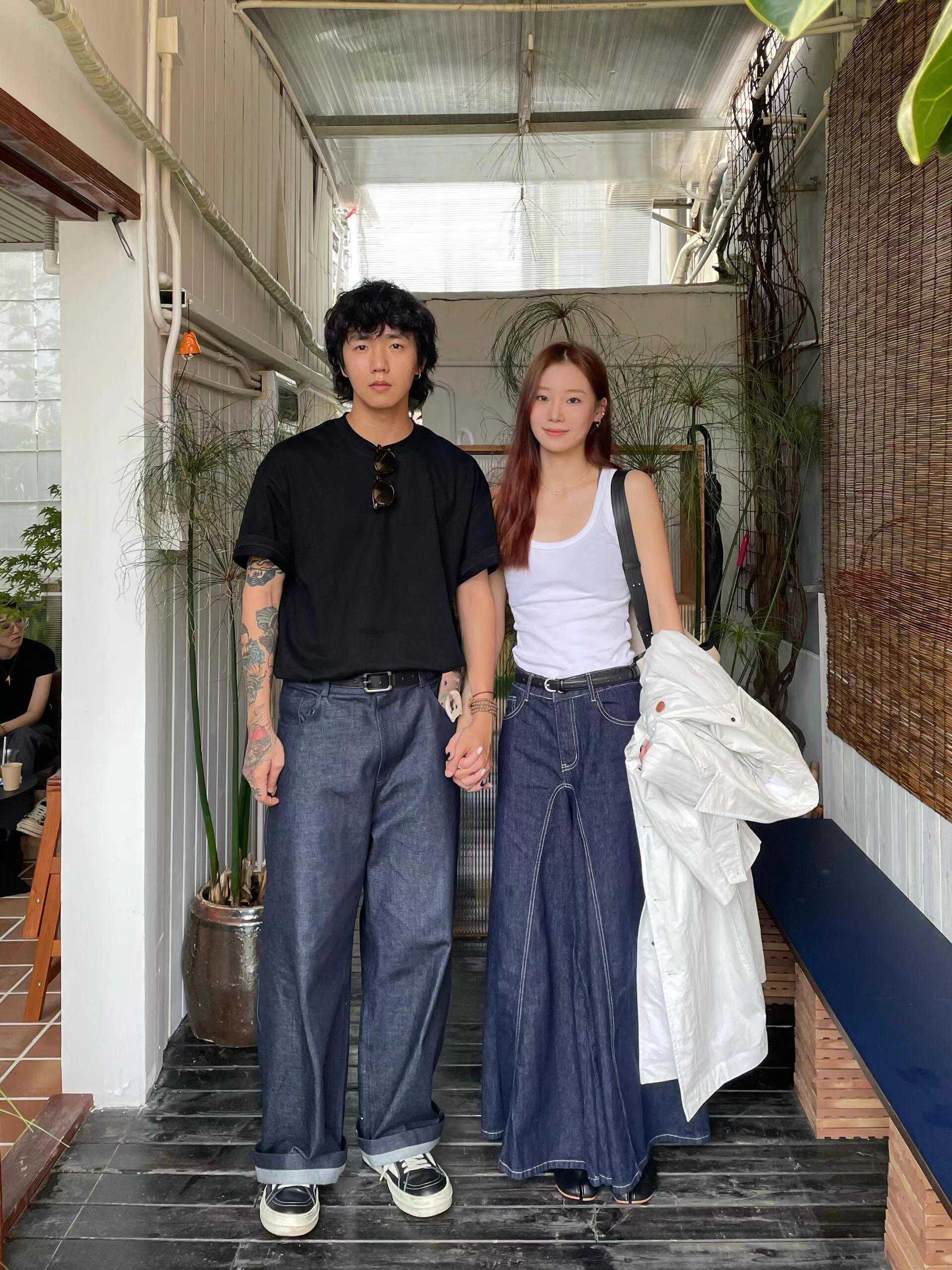 男生穿着一条经典的牛仔裤,搭配一双简洁的白色运动鞋,整体给人一种简约而大方的感觉。而女生则在简约的基础上加入了个性元素,她选择了一条不规则剪裁的半身裙,搭配一件设计独特的上衣,展现出她独特的时尚品味。两人的款式选择既相互补充,又各自独特,形成了一种和谐而统一的视觉效果。