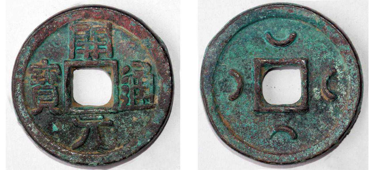 此件银质钱币规格为:直径95毫米、厚度约为9毫米、重量未称,估计有350克,也就是7两重。遵循先易后难的原则,文字咱们不认识,那就先从背面的符号认起,在圆形方孔银币背面上方铸有一枚月牙形凸起图案,这个图案在钱币中称为“上俯月纹”上指的是位于钱币方孔的上部,俯指的月牙呈下弯方向。而方孔上下左右皆可有月牙图案,月纹上弯状的称作“仰月”;在方孔侧立的称作“斜月”。唐代的“开元通宝”方孔上下左右更有“四月”钱币铸造的出现。