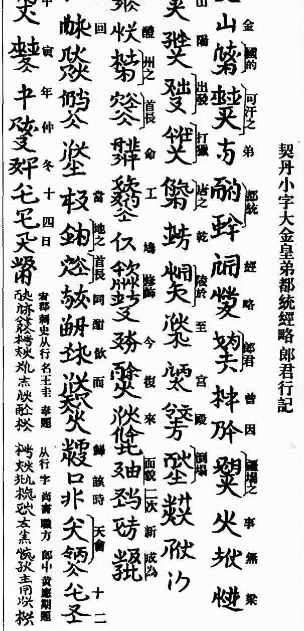 契丹文字是中国的古代少数民族“契丹族”于公元920年依据汉字创造出来的文字。分大字和小字两种。大字相对小字复杂一些。据说有一千多个文字,另有一说有三千多个。不知是不是如此,咱们汉字常用的也就3000个左右。契丹文大字和小字并行,仅大概使用了270-300年左右,在1191年后逐渐被废用,隐没在历史的更迭中,从元朝算起距今750年,经历了元、明、清、民国、中华人民共和国五个朝代,能真正识别契丹文字的人寥寥无几。