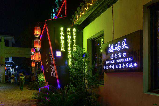 酒吧街,位于景区门口右,是一条L型的街道,飘邈音乐之旅、船码头、朽木、夸父、路人、宴遇……