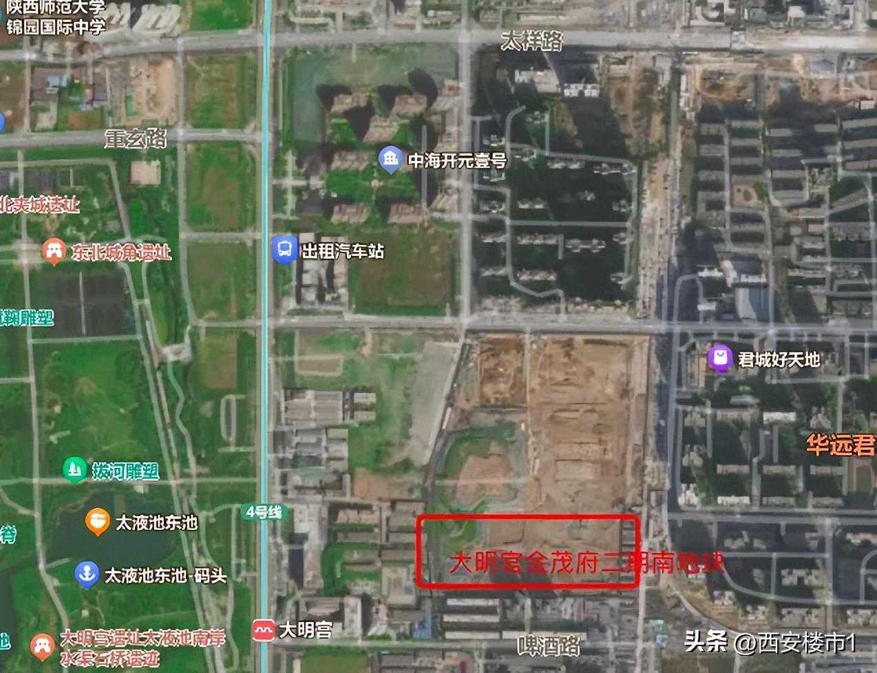 此次公示的大明宫金茂府二期,是二期的南地块,位于太元路以南,红旗铁路线以西,汉斯啤酒厂家属院以北,马旗寨路以东。