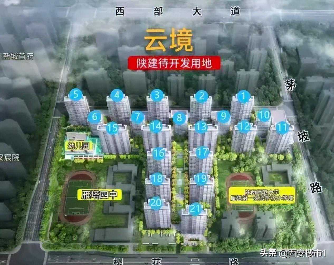 项目占地约137.04亩,总建筑面积约33.6万㎡,容积率约2.8、建筑密度约20%、绿地率约35%,一墙之隔就是陕西师范大学雁塔第一实验小学和陕师大附中。