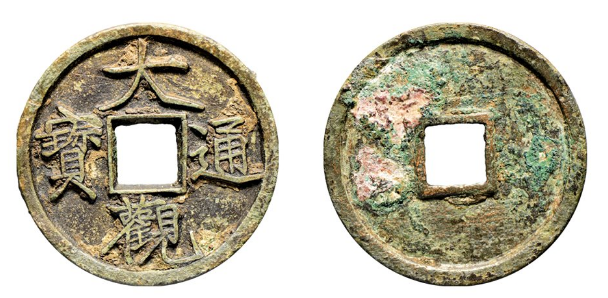 北宋·徽宗大观通宝折十(直径41.5毫米,厚2.9毫米,重17.5克),降通,大观通宝折十为中国古代钱币铸造工艺之巅峰,此品种钱文俊秀,铸造精整,几无铸造瑕疵,是中国古代钱币收藏之必备品种,ZDGS-85