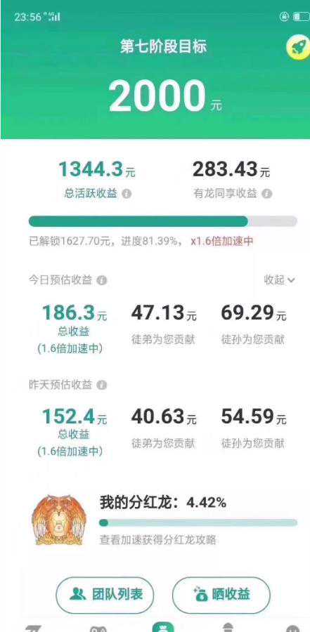 最后告诉大家只要你推广的徒弟徒孙越多,必得分红龙的进度条就涨得越快!活跃收益加你100%拿到分红龙,每天的收益就非常高了。