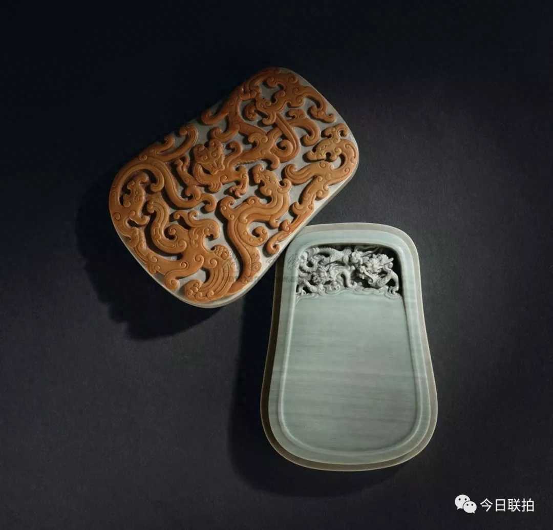 清雍正琉璃盒松花石如意纹砚成交价:RMB2,744,000北京保利5周年秋季拍卖会『宫廷艺术与重要瓷器工艺品』蓝色套料玻璃砚盒,亦作如意形,以浅蓝与深蓝相套而成,深蓝处刻龙凤纹,龙凤长长的身躯彼此环绕,龙凤相望,龙凤呈祥,龙身有鳞纹相饰,间有红绿宝石镶嵌,可谓点睛之笔,盒内鎏金。砚盒上的龙凤纹与台北故宫博物院藏雍正松花石龙凤砚盒上的龙凤纹时代风格一致。