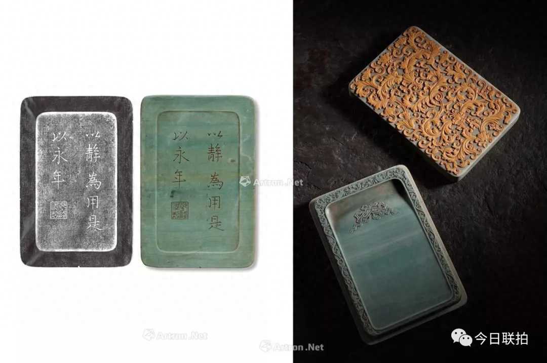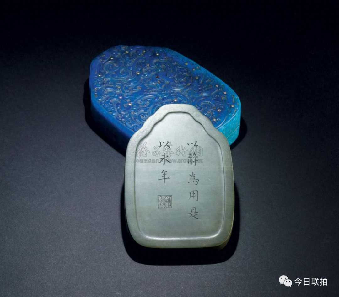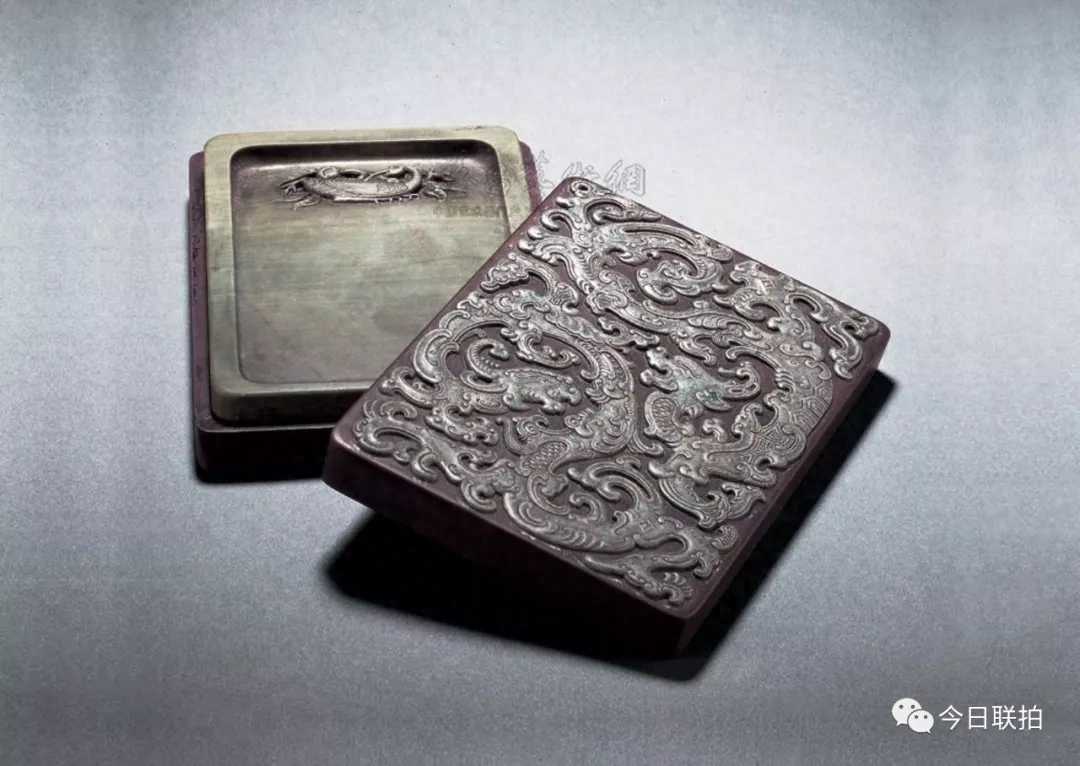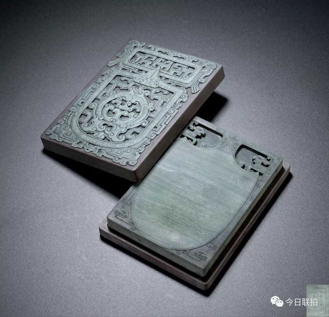 清玉佩纹松花石御铭砚成交价:RMB1,012,000北京保利十二周年春季拍卖会『宫廷艺术与重要瓷器、玉器、工艺品』砚堂大略呈韘形,韘是一种流行于西汉的玉佩。砚盖亦是以韘纹为主题,紫、绿二色相间,雕刻复杂的夔龙及兽面纹饰,纹样富贵华丽,与砚面简单的纹样形成繁、疏有别的艺术风格。