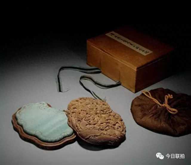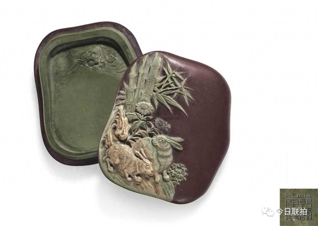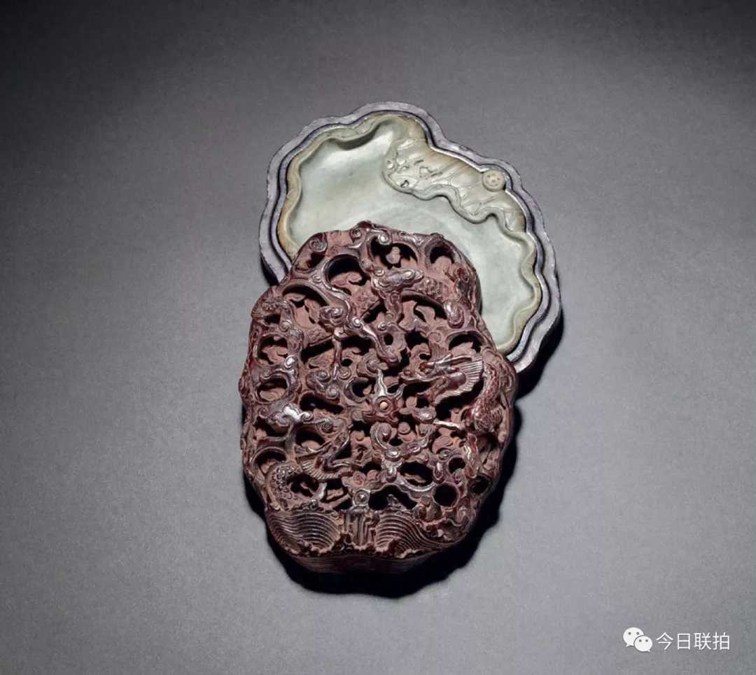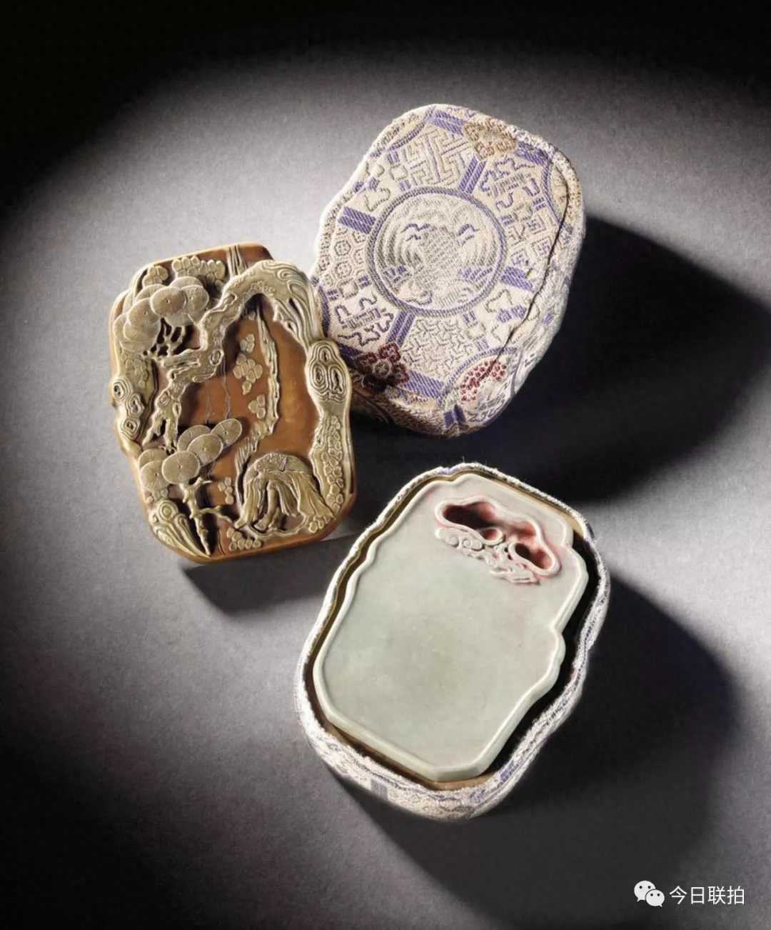 清玉佩纹松花石御铭砚成交价:RMB1,012,000北京保利十二周年春季拍卖会『宫廷艺术与重要瓷器、玉器、工艺品』砚堂大略呈韘形,韘是一种流行于西汉的玉佩。砚盖亦是以韘纹为主题,紫、绿二色相间,雕刻复杂的夔龙及兽面纹饰,纹样富贵华丽,与砚面简单的纹样形成繁、疏有别的艺术风格。