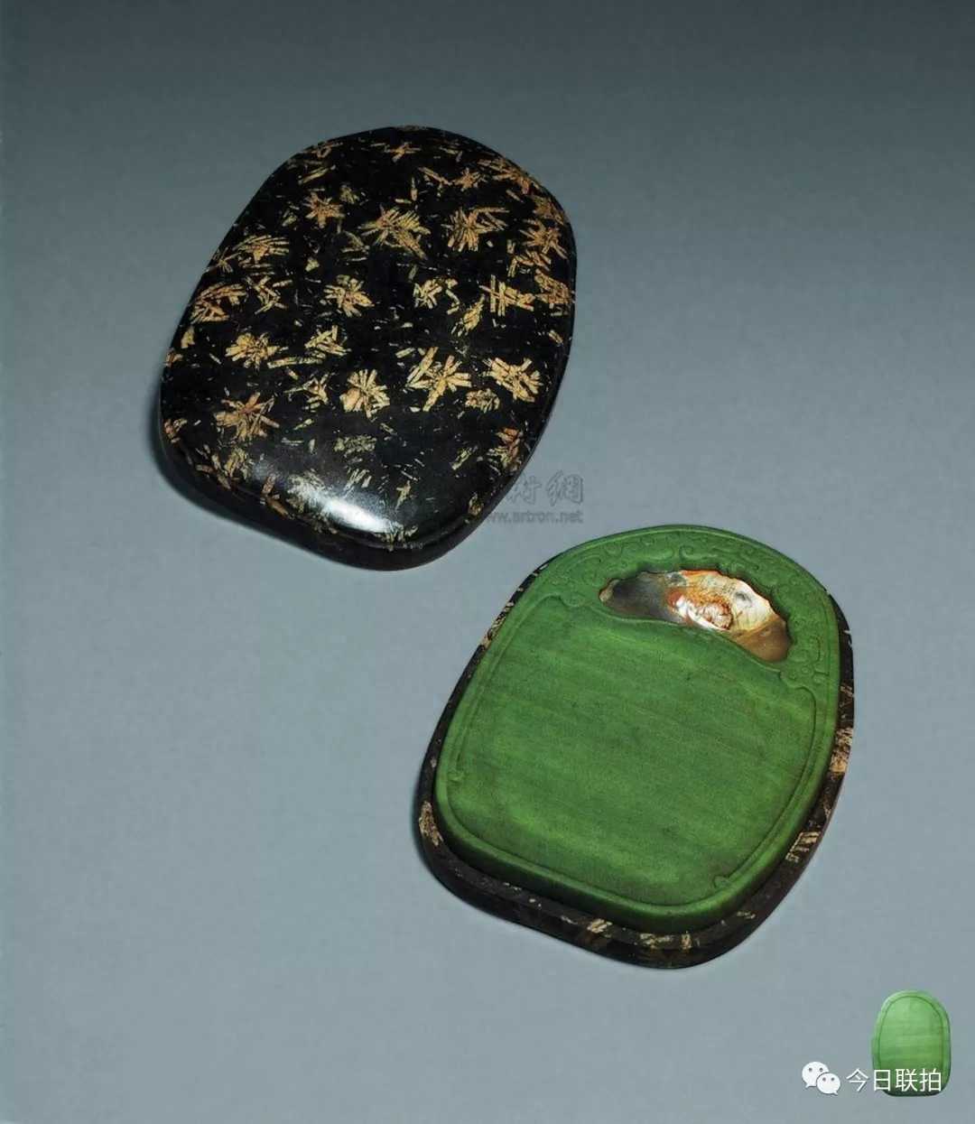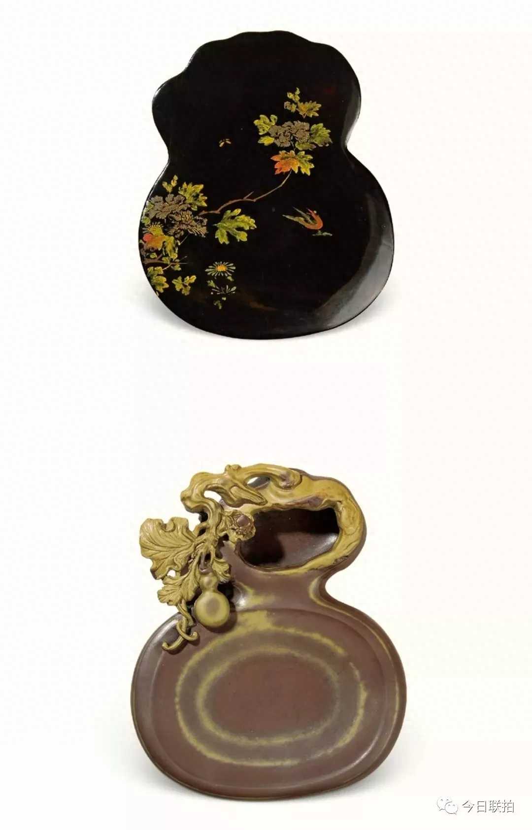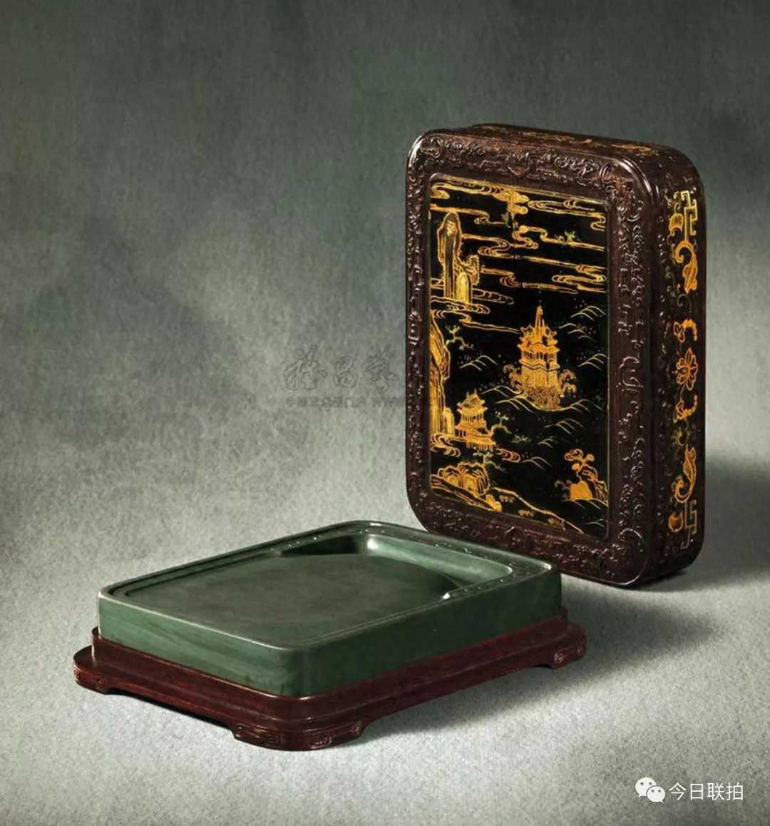 清雍正松花石葫芦形御砚成交价:RMB1,092,500中贸圣佳2018春季艺术品拍卖会『璀璨③——「弘曆的帝王品味」古代艺术珍品及宫廷瓷器专场』此砚配有洋彩装饰花鸟的漆盒,此种黑漆描金工艺在雍正朝十分流行,雍正帝一向钟爱深沉凝重的黑色,这在同期的画珐琅、瓷器中多有体现。而洋漆的艺术表现,正是以黑漆为基色,上面描饰金色的花纹,必然受到雍正的喜爱。