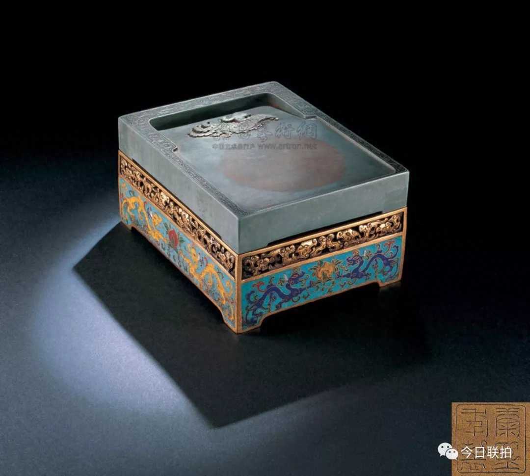清康熙掐丝珐琅御制暖盒松花石雕凤纹砚成交价:RMB1,680,000北京保利2008春季拍卖会『文馨阁集珍』掐丝珐琅砚盒四面施浅蓝色珐琅釉为地,上饰夔龙捧寿纹。四边口沿为铜镀金镂空夔龙纹。底方框内錾阴文”康熙年制”四字篆书款。今北京故宫博物院仅藏有一件如本件带有康熙年款珐琅砚盒的松花暖砚,或同为宫中制砚名手金殿扬、顾公望的作品。