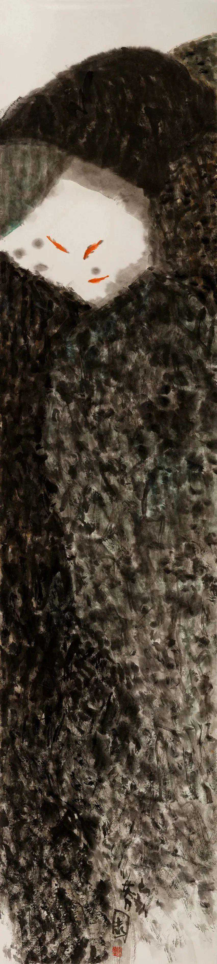 郭莽园笔下花鸟、山水、人物无所不涉,花鸟动物常常是几笔线条,几团色墨,寥寥数笔,趣致生动,意味之外,神韵别具;山水景物则或野逸苍茫或简约高旷,或壁立千仞孤舟一叶,或山脉绵延鹭鸢形随,画外有画,画中有话;人物形象则多是点景抒意,或乘月瑀行或拄杖叩门,或骑乘闲逸或劳作牧野,往往略树勾勒,色墨点抹,直抒性灵,意尤未尽……