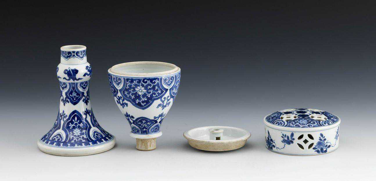 香薰由器座、承柱、托盘、器盖四部分套合组成,器底座与承柱口均呈喇叭形,承柱下端为圆柱榫卯,插入器座,上下连成一体,承柱口上置托盘,两者吻合紧密,盘内中心有一小管,管近底处对称方形镂空。盖壁与盖面镂空呈交错布局的四钱纹,盘内的袅袅香烟可通过盘内小管、钱纹镂空处飘出。此类熏炉造型独特,应该是根据西方的要求生产的。器腹所饰多层如意花卉纹是康熙外销瓷上的流行纹样,时代特征鲜明。倪汉克2008年捐赠。(刘志钧文/图)