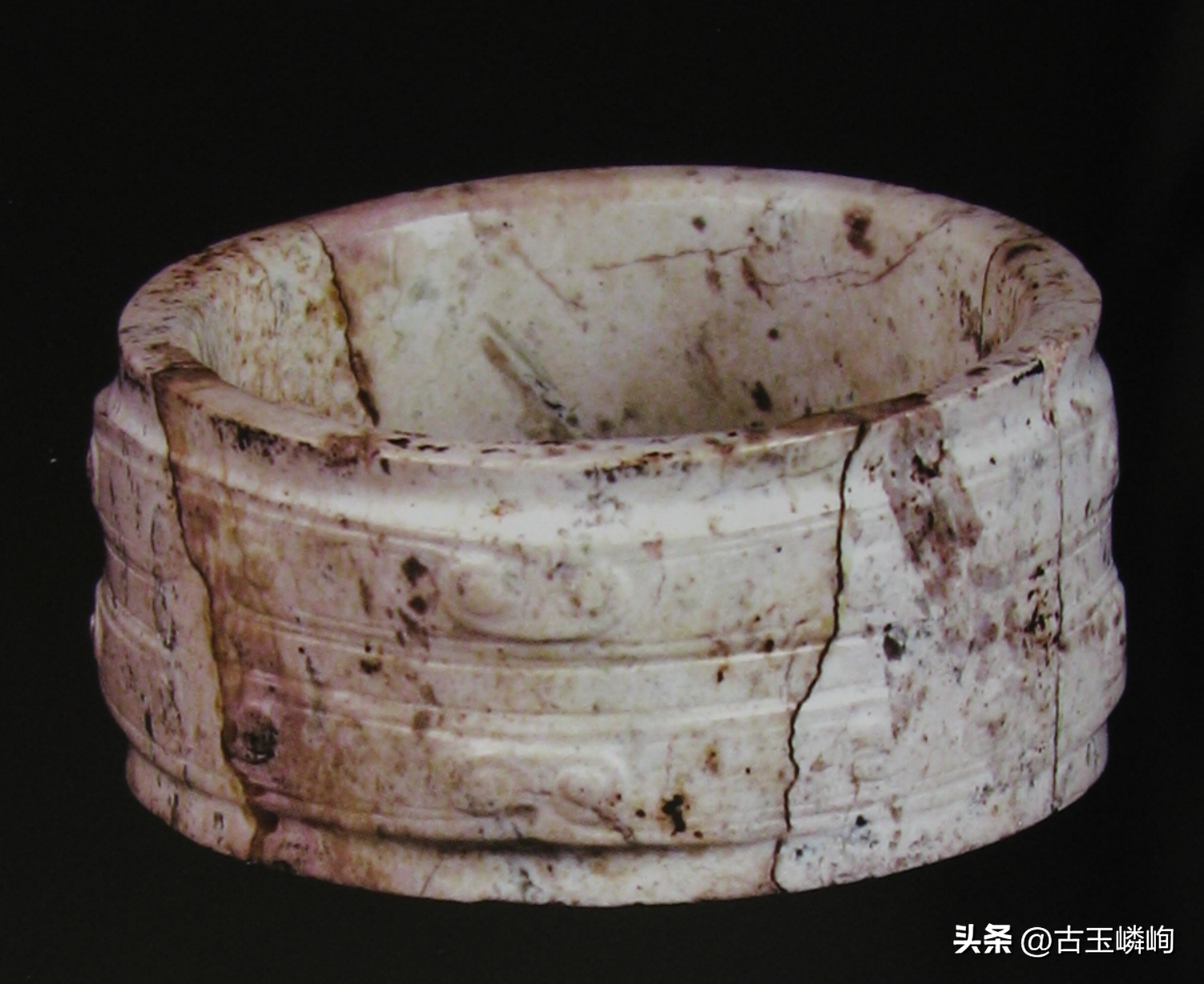 玉琮商代晚期高3.6-4.2、上射径7.5-7.8、下射径7.6-7.8、射壁厚0.5-0.8厘米。江西省新干县大洋洲商墓出土,现藏于江西省博物馆。磷铝石质。灰白色,有墨绿色斑点,玻璃光泽,不透明。器体不规整,高矮不一,呈外方内圆形,器体较矮,形似镯。上下有短射,中间一宽浅槽将四角和整个琮体分为上下两节,四角有凸棱,并以四角凸棱为中线,上下各饰由卷云纹构成的简体兽面纹一组。阴线条都是采用砣轮琢制,线条一般中间较深,两端较浅细。