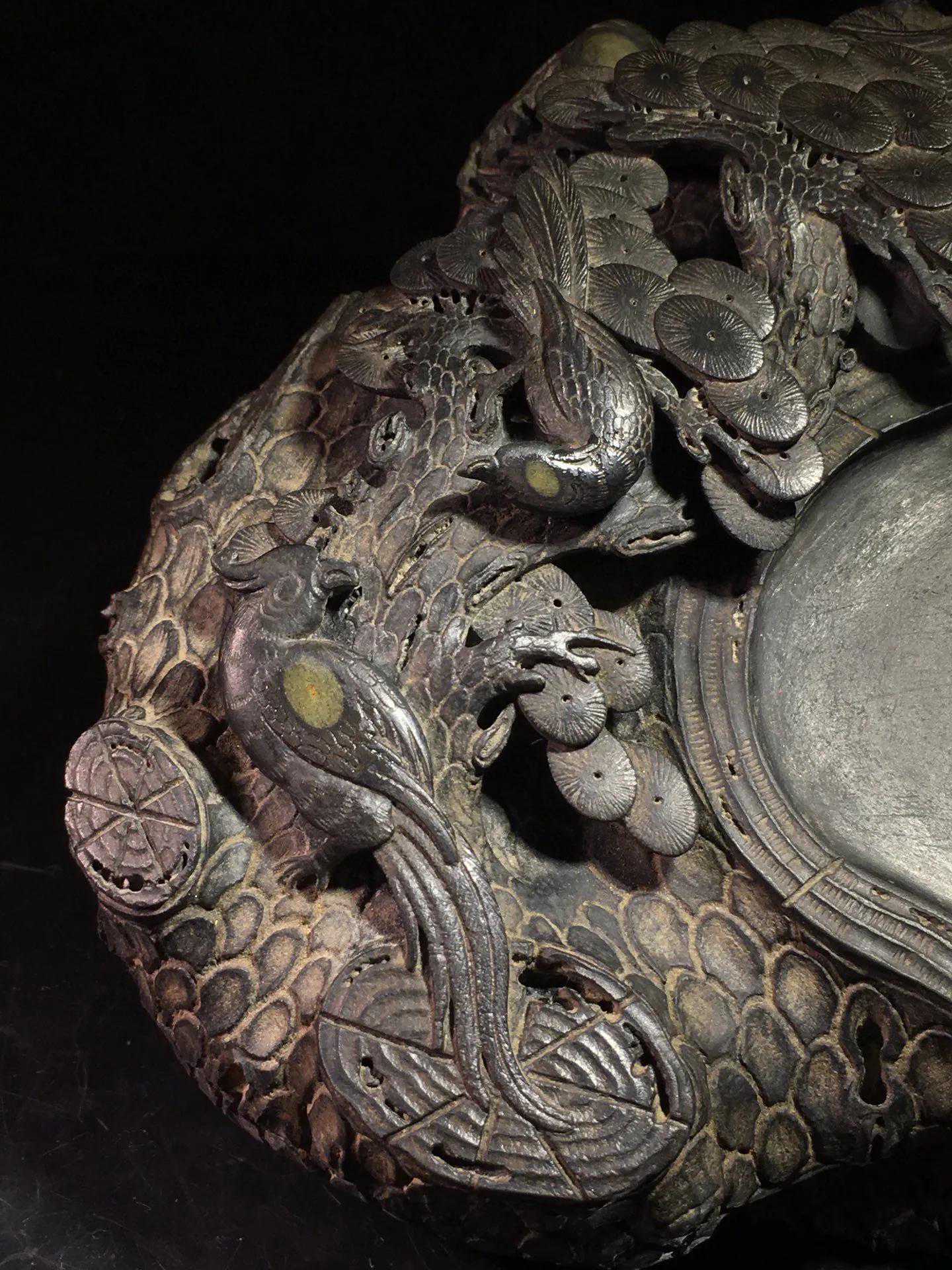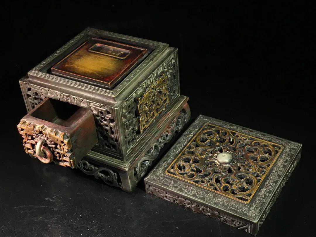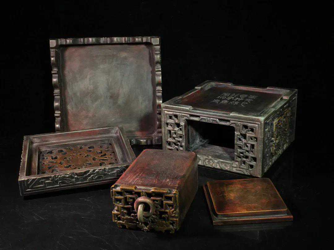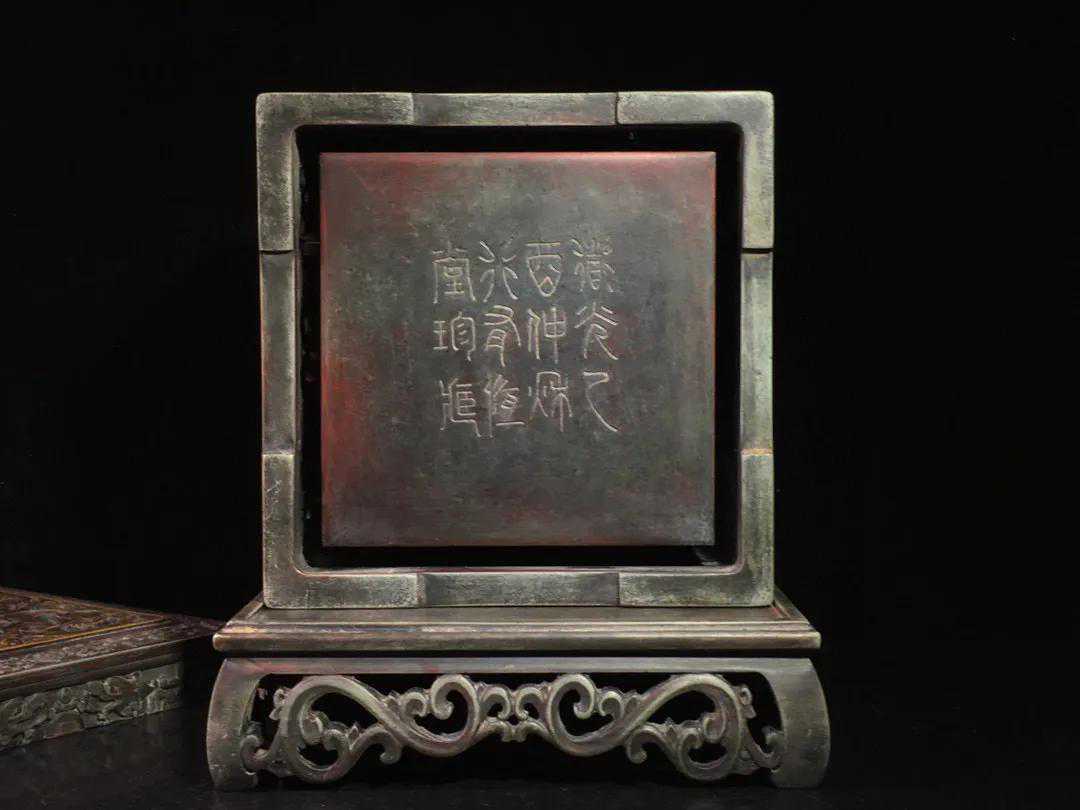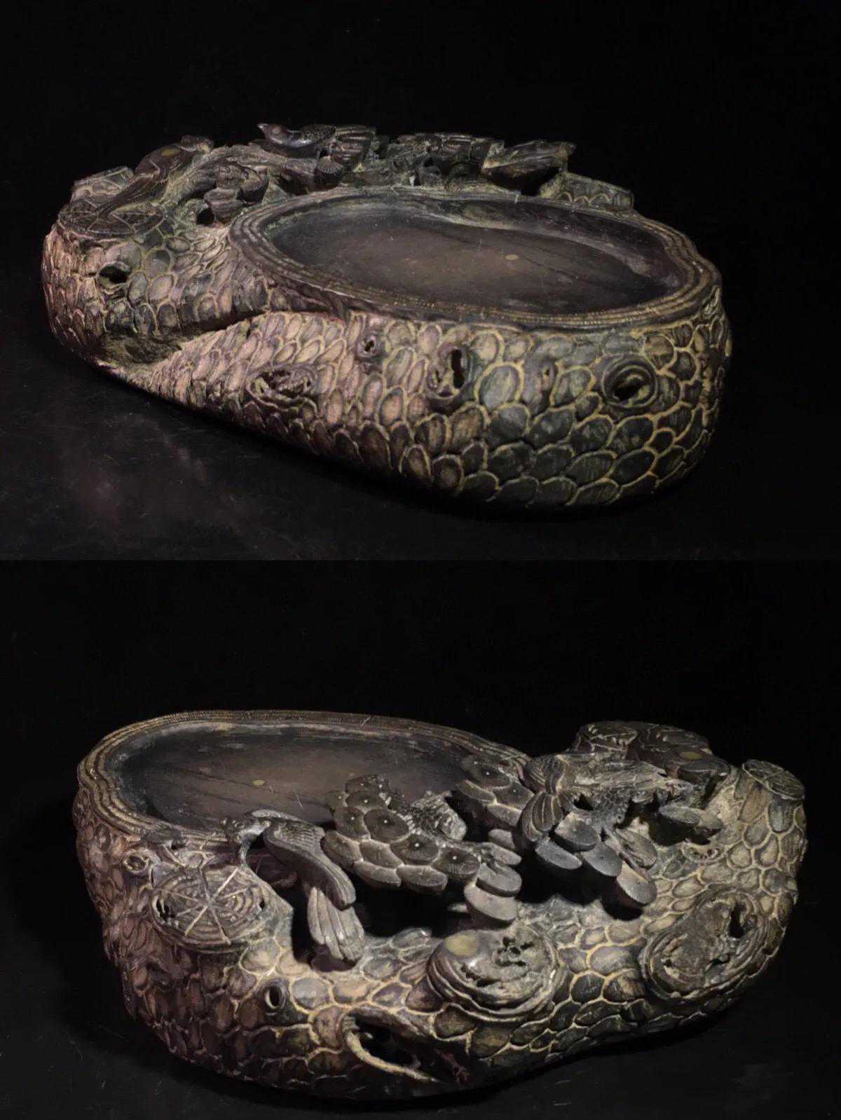 旧藏松花石双龙戏珠抽屉暖砚,朱砚(研磨朱砂的砚),选料精良,质坚理润,器形华丽,镶嵌完美,镂空工艺精湛,中间抽屉可储热水防止冬天磨墨结冰,铭文劲挺,包浆醇厚,案几陈设气势非凡,收藏赏用珍品。
