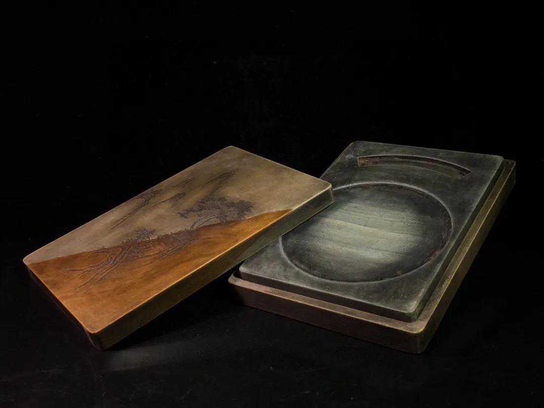 旧藏松花砚仙山云海石盒套砚,石料考究,质坚理细,天然双色俏色完美,构思巧妙,陷地刻工艺精细,盒底铭文劲挺,包浆浑厚,款:汪洵。收藏赏用佳品。