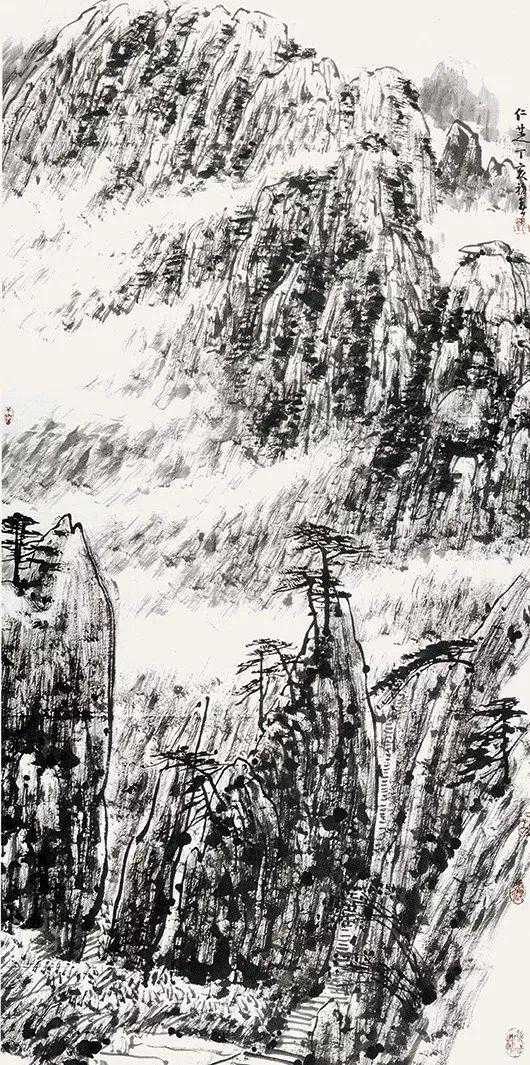 他的画有的偏重于写实,有的以水墨为主,有的则彩墨并举;有的枯笔散点,虚中求实,有的规整严谨,实中求虚;有的点线交响,在轻松率意中显现山体跌宕的美质,有的层层积墨,在大气磅礴中追求雄强浑厚的品格;有时泼墨壮写,有时淡墨轻岚;有时追求光影效果,以求黑白之变,有时引入现代西法,以取抽象表现之美。
