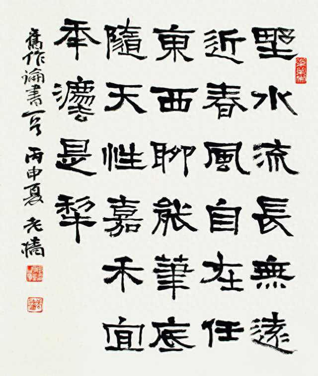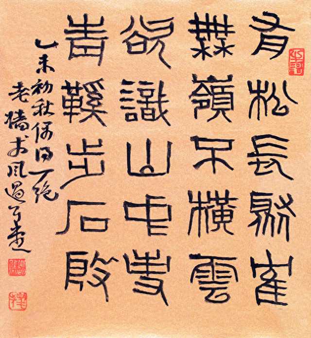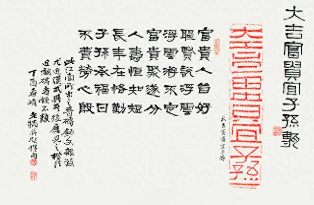 赵熊先生的书法功力扎实,诸体皆能,尤以篆隶和行书著名,他在书法创作上的成功创造在于集多年深厚的篆、隶基础,创作出别具一格的"五分书",即以篆书之形,表隶书之神,篆隶笔法各取一半,入古出新,气势磅礴而旷达。