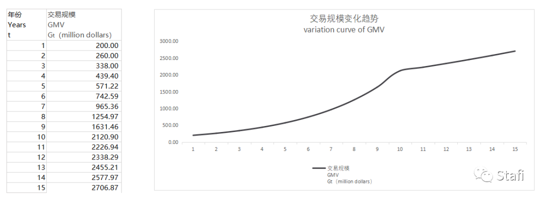 假设一个token模型为积分模型的区块链项目,今年的链上交易规模为2亿美元(G0=2亿美元),预期未来10年以30%的速度增长,到第11年进入平稳运营期,增长率降低至5%