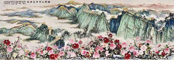 岳黔山:那个状态和自己平时的创作还是不太一样的,比如建国70周年我给天安门城楼上画的那张画,它首先要符合建国70周年庆典的主题和氛围。那张作品画的是长城和牡丹,它在将花卉和山水结合的同时又要突出主题,这就很难了。一是表现方式上很难,二是色彩上很难。我结合了天安门城楼的内部装饰,如雕龙画柱、红地毯等传统的中国风,力求跟环境相和谐,然后采用了没骨的小写意手法来画牡丹,用青绿山水的方式来完成长城和大山的处理。
