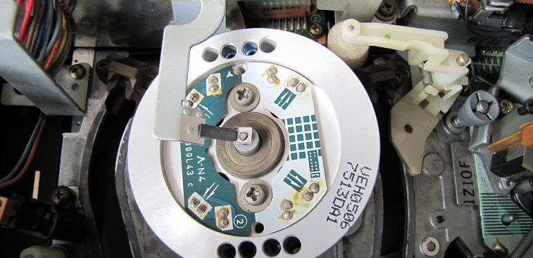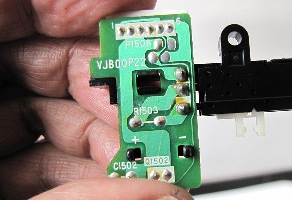 卸下倒带电机同步皮带和固定其的三个螺丝,拔掉音控磁头上方插件使倒带电机总成与机芯本体脱开,再卸下压带轮组件,即可完全暴露方式选择开关,卸下其固定两个螺丝,再焊开状态开关的5个焊点,即可取下方式选择开关,捏住四个白色卡子即可卸开方式选择开关,可见其内部铜黑氧化也比较严重。以拆卸反方向把机器装回。