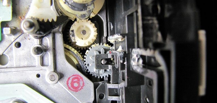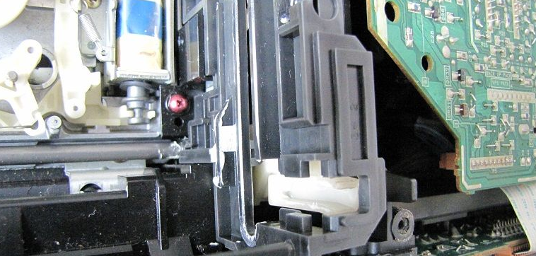 再卸掉带仓总成的4个红色金属螺纹螺丝,取下带仓总成,掰住三个卡扣,即可卸下带仓传感开关,把其电路板上的三个焊点焊开,取下带仓传感开关,轻轻撬开其周围三个卡扣,撬开带仓传感开关可见其内部铜黑氧化比较严重(分别按拆卸顺序放于一旁,螺丝分类按拆卸顺序放好)。