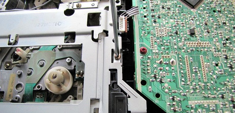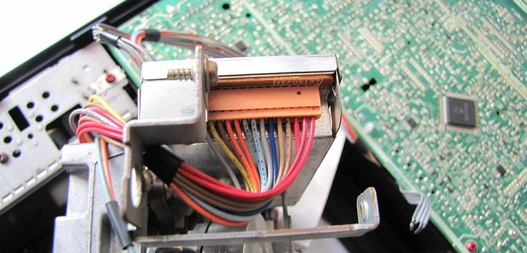 把机芯从底盘内整体提出,拔掉磁头放大电路板的14针(线)插件和磁鼓电路板10针(8线)插件,再拔掉FG放大电路板(18针至主板)FPC和机械电路板(15针至主板)FPC后,机芯总成即可完全与底盘脱离,单独进行机芯维修很是方便。