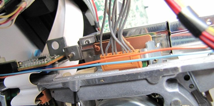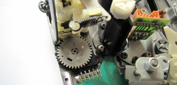 松下G型机芯的带仓传感器和机芯的状态开关是在CPU的预设程序下协调配合完成系统控制,卸下前面板,再卸下VR电路板,卸掉两个固定机芯的金属螺纹螺丝和机芯后中的一个自攻丝螺丝,掰松带仓传感电路板(6针)锁扣,分别松开其6线(4线往主板、2线带仓带尾光敏管的连线)。卸下带仓上盖板两个螺丝,并卸下带仓上盖板,取下带仓。