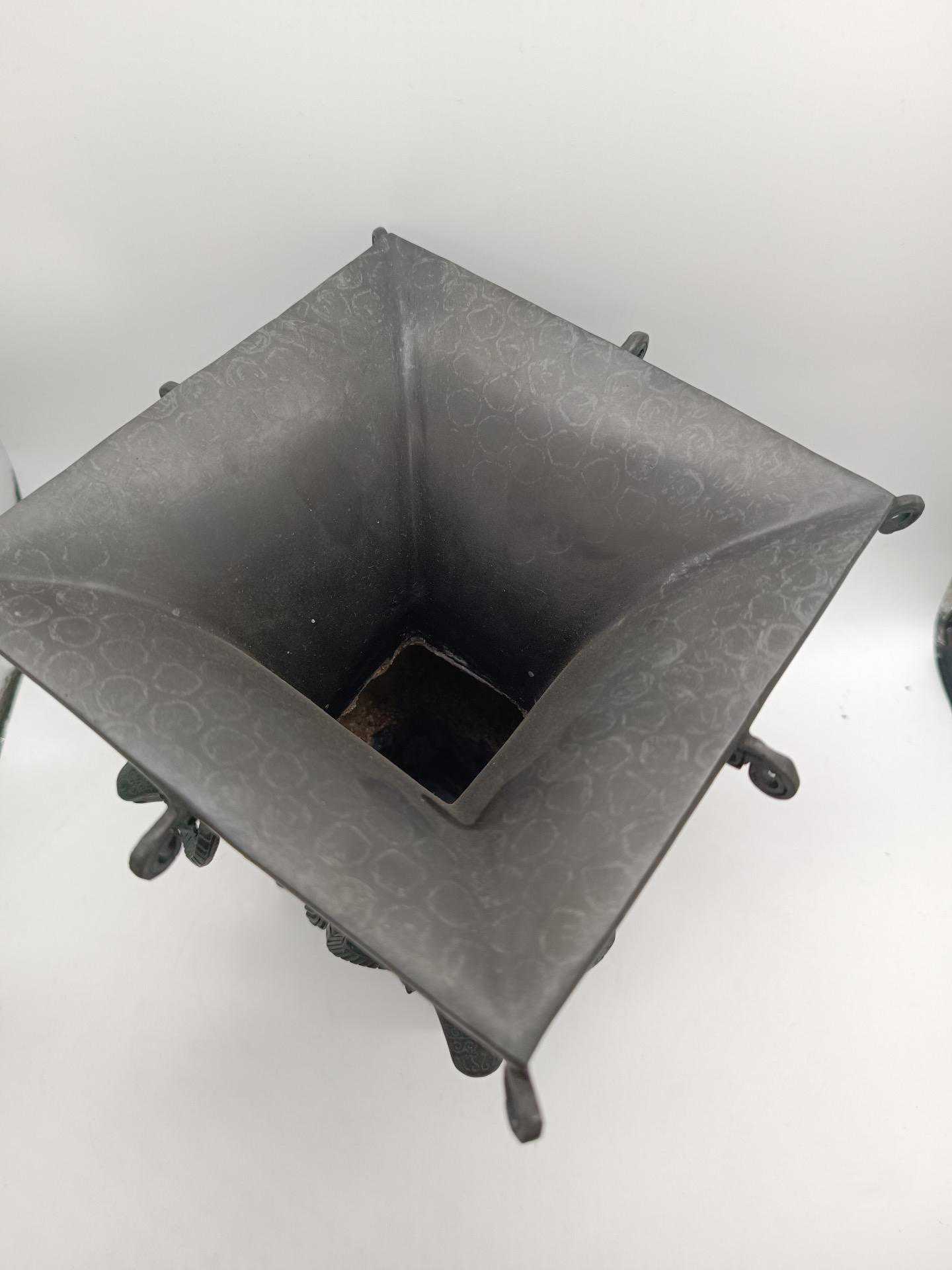 四羊方尊器表布满纤细的云雷纹,颈部装饰有蕉叶纹、三角夔纹和兽面纹。方尊的肩部装饰为蛇身而有爪的龙纹。龙纹为高浮雕,从方尊的四边蜿蜒于前。每一面的龙纹中间,都有一个双角龙头从方尊器身上探出来。