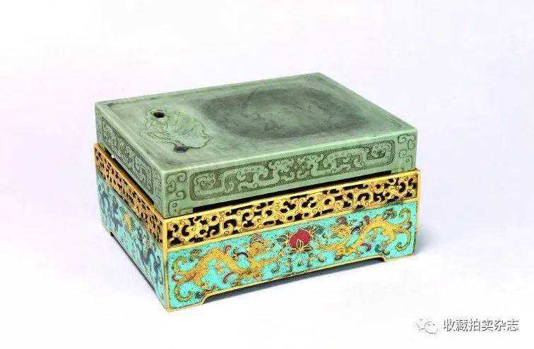 松花石雕荷叶纹池珐琅匣暖砚