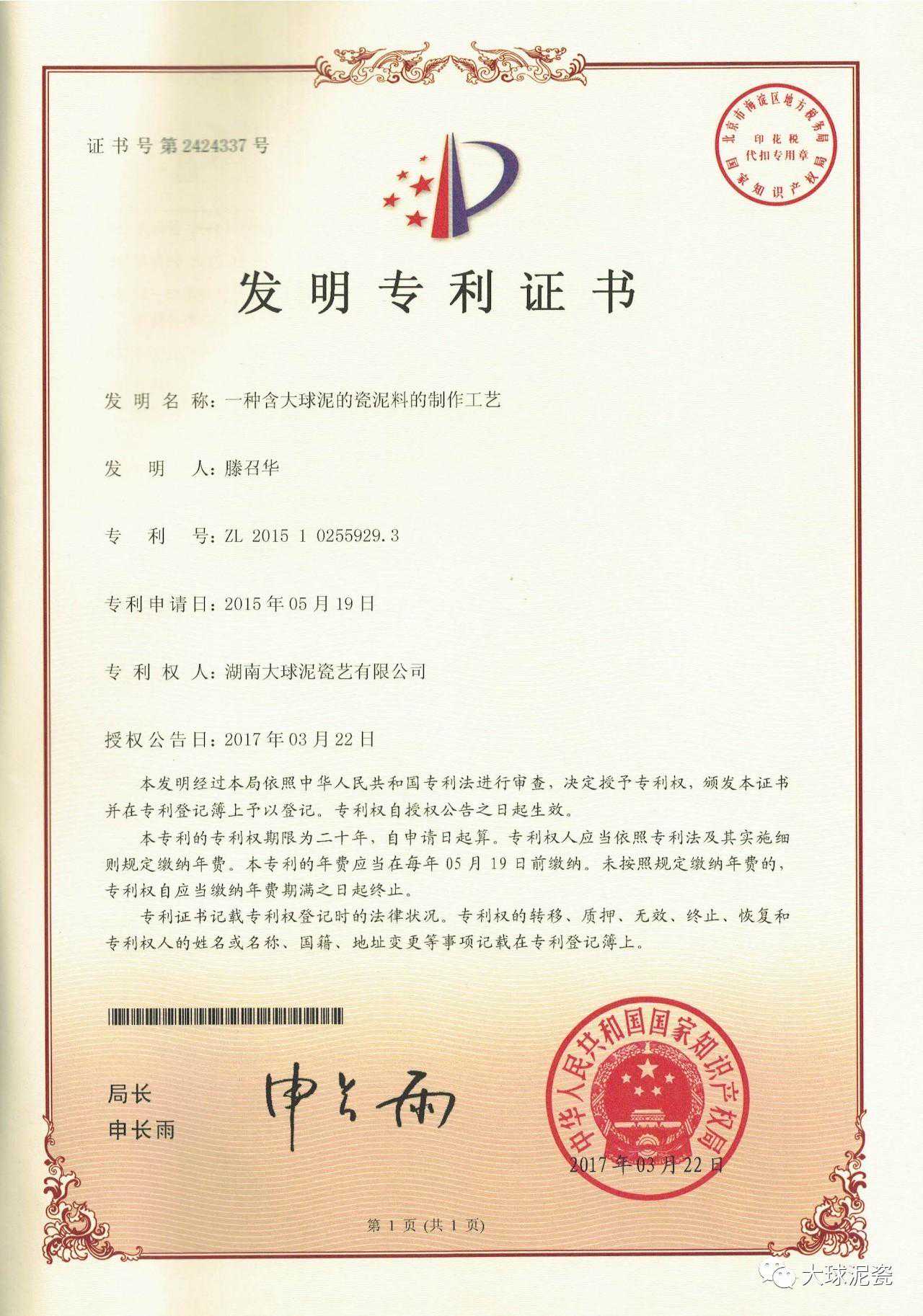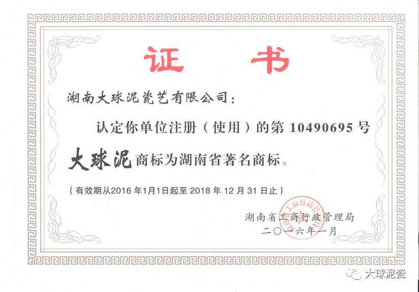 湖南大球泥瓷艺有限公司生产和销售的以大球泥为原料的高端艺术瓷,均使用“大球泥”或“大球泥瓷”商标,并在收藏证书上印有产品的编码和销售总编号,可供随时查询真伪。
