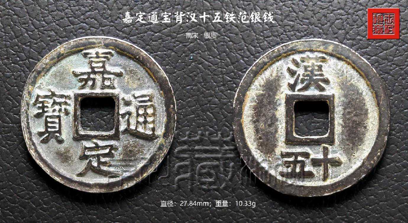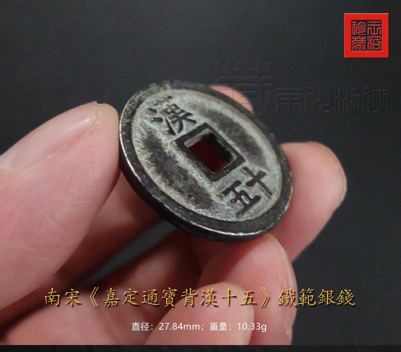 而检点愚帐中所藏,早前曾经猎获一品嘉定通宝背汉十五折二银钱,品相颇佳,根据三相一材辨识,具有较鲜明的母相,其是否为银铁母,赏不确定,然其至少是为铁范银钱,应无疑问,极其罕见。是故,今日特将其帐中点出,拍照亮相,遣之于此公展鉴赏,以飨泉好。