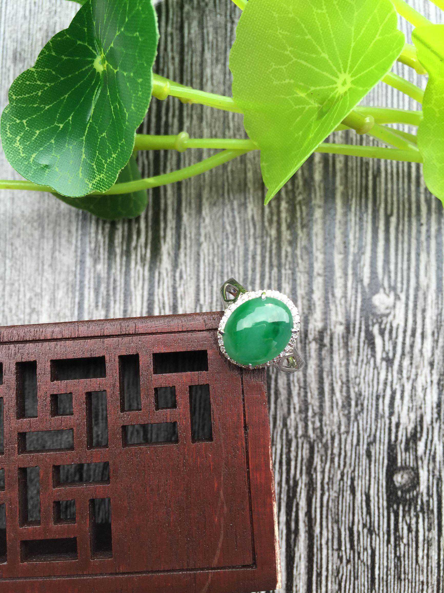 十万元以上的翡翠戒指都可达高冰种乃至玻璃种,此类翡翠戒指的戒面大多数为绿色,根据绿色的浓淡,均匀程度可进一步划分,好的翡翠戒指不仅使用贵金属来做指环,戒面的周围还会根据要求镶嵌钻石,更加凸显翡翠戒面的高贵典雅。老坑玻璃种满绿色的翡翠戒指价格最高,颗粒饱满给人以清翠欲滴的感觉,尤以祖母绿色最为稀少,再加上颜色均匀,水头上等,光泽度好的戒面可被视为珍品收藏。