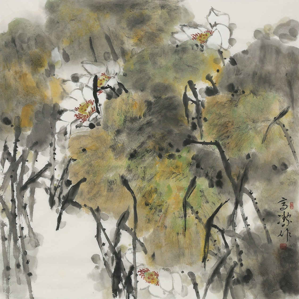 李氏高洁,巾帼丹青名家也。数十载筑佳作而成名,花鸟、山水、人物、猛虎,其笔也萧散,其气也疏酣;其墨也苍茫,其境也幽覃。状林泉而深秀,撷自然之空灵。《宣和画谱》言:“形似少精,则失之整齐;笔墨太简,则失之简略。精而造疏,简而意足,惟得之于笔墨之外者知之。”高洁熟谙古典,创《晌午》、作《夏凉》,品《咏叹》,呈精匀而疏淡,阴阳、动静、虚和实,和谐而致简;读《忆秋》《欢乐日子》甚或《梨乡四月花如烟》,高标逸韵,如锦灿烂;潇洒清风,煌煌罩染;气韵勃发,千古流变;恍恍如“采菊东篱下,悠然见南山”,此中有真意,欲辨已忘言!《荷塘月色》,静趣同山,清寂脉脉,韵致无限;数枝荷花向月展,款款柔媚凛凛然!天人合一,灵魂、生活乃交感。