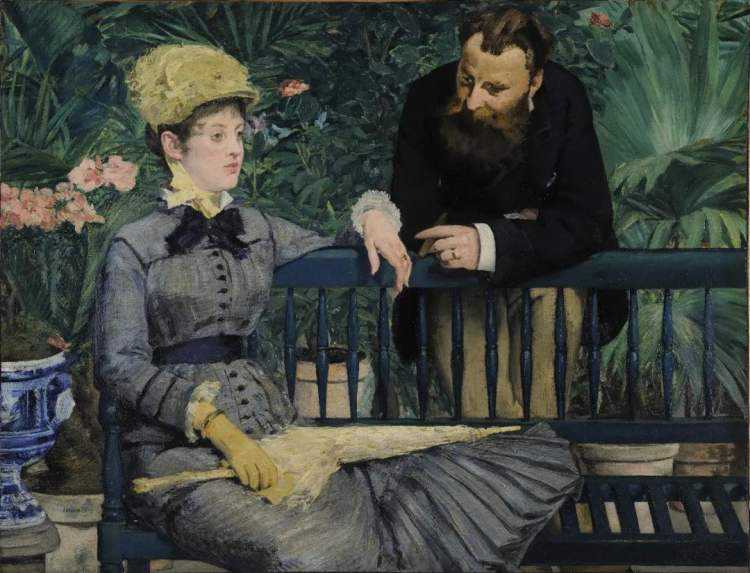 “首先,我们发现马奈的这幅作品是反空间的,他把这张画的空间压缩得极为扁平,几乎没有空间可言。整幅画只有前景,而前景中的那两个人物的背后就是密不透风的植物和鲜花,没有任何纵深。而且,整幅画的视觉导引,也就是与画面平行摆放的椅子所构成的垂直线。整件作品几乎是一个由水平线和垂直线构成的画面。所以,格林伯格认为,从马奈开始绘画走向了平面,这个说法用在眼前这幅画里是说得通的。”