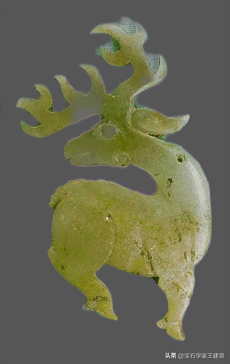 02-2-1、鹿角的艺术夸张程度远远超过商代,像小树一样矗立在头上,有对称与不对称之分,这是西周玉鹿纹的典型特征。