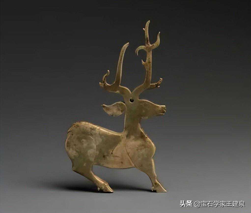 春秋战国玉鹿依然沿袭西周的特征,仍以薄片状多见,与西周玉鹿比较起来,这一时期在鹿角、眼形及纹饰等方面则发生了一些变化,主要表现为: