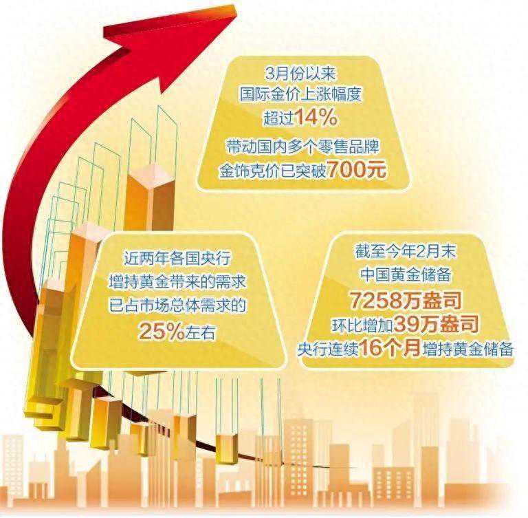 东方金诚首席宏观分析师王青认为,以美元计价的国际金价持续攀升有三方面原因:一是当前正处于美联储降息的预期升温阶段,黄金需求增加是正常的市场反应;二是年初以来多国央行仍在继续增持黄金,地缘政治风险的上升及全球贸易环境的高不确定性,让各国央行更加重视黄金储备,数据显示,近两年各国央行增持黄金带来的需求已占市场总体需求的25%左右;三是今年春节以来,国内民众购金热情高涨,除了季节性消费需求释放外,也与资本市场波动性加大、黄金投资属性凸显等因素有关。