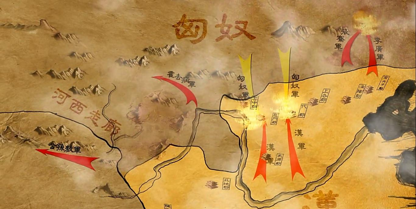 第五战,想直接和单于对战,汉武帝因为李广屡次运气差,暗中指令卫青不让李广直面单于,李广只好出东道,迷路,直到仗打完了,卫青回到漠南才遇到李广,询问李广具体情况,李广感觉凶多吉少,就自杀了。