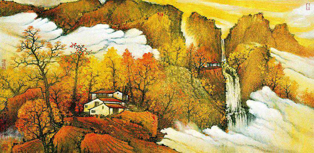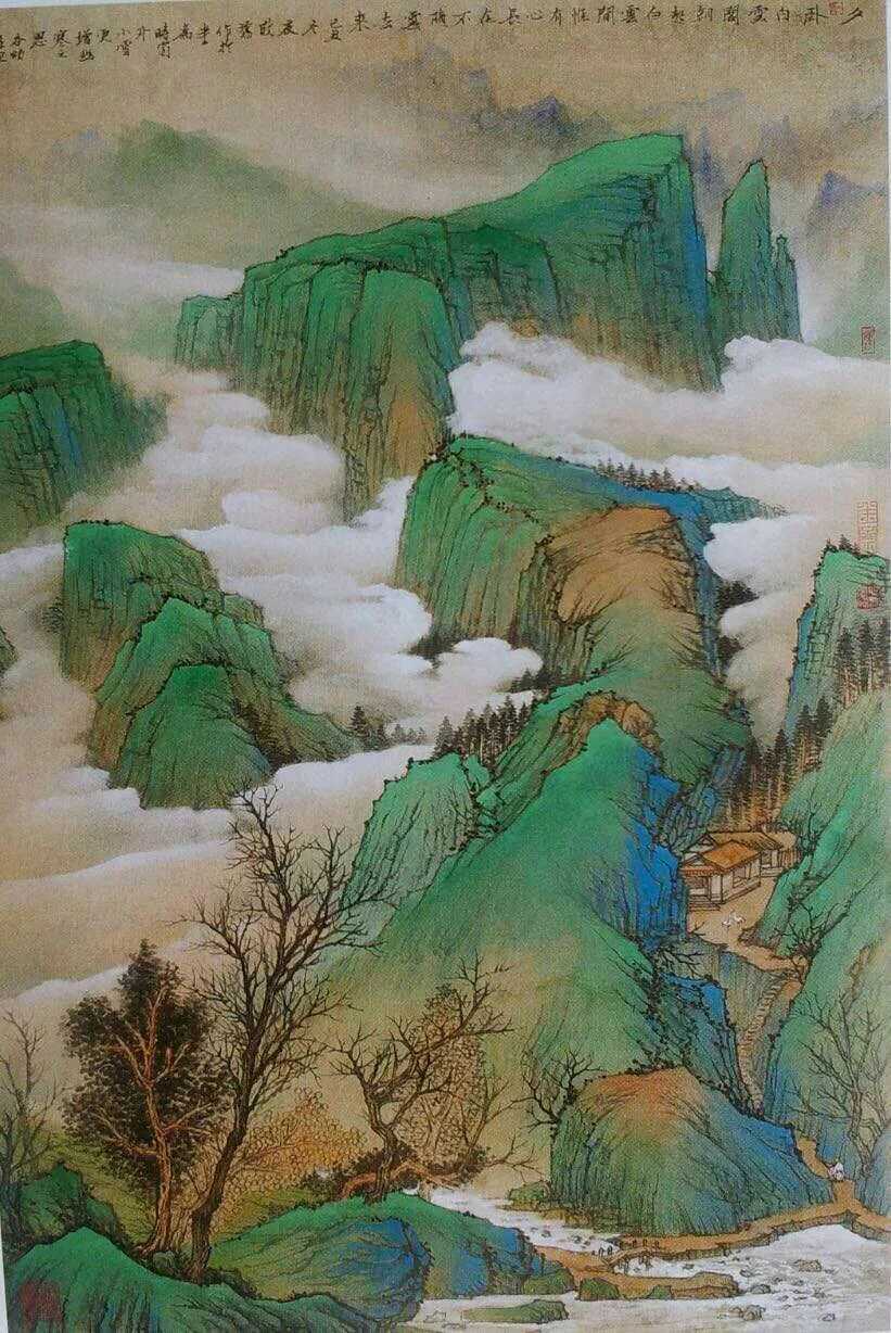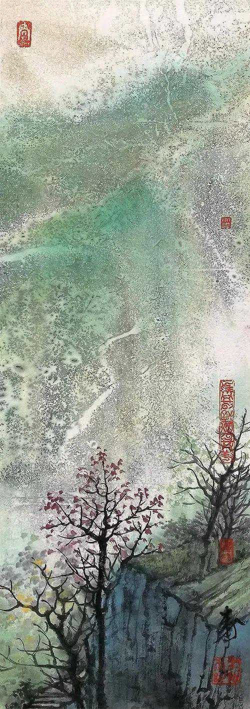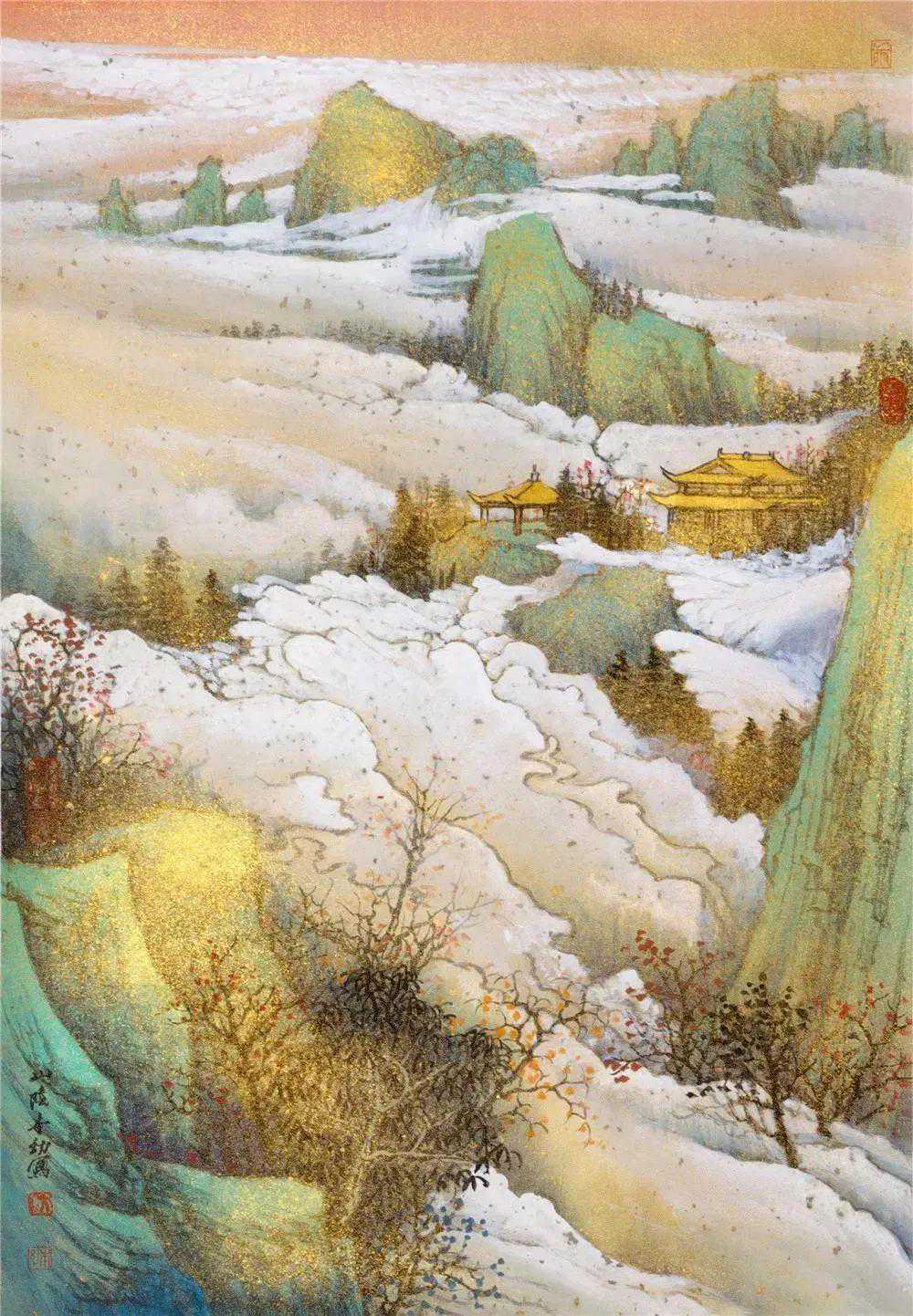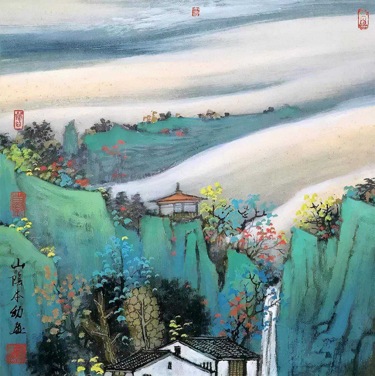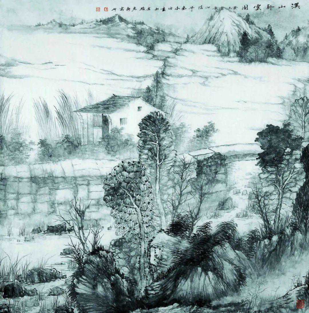 水墨水乡,承米家、青藤之气而另有所悟,集灵动秀逸与朴实淳厚于一体;金碧重彩,追晋唐遗意而糅合今法,力求清丽大方,与水墨体虽异而用同妙。