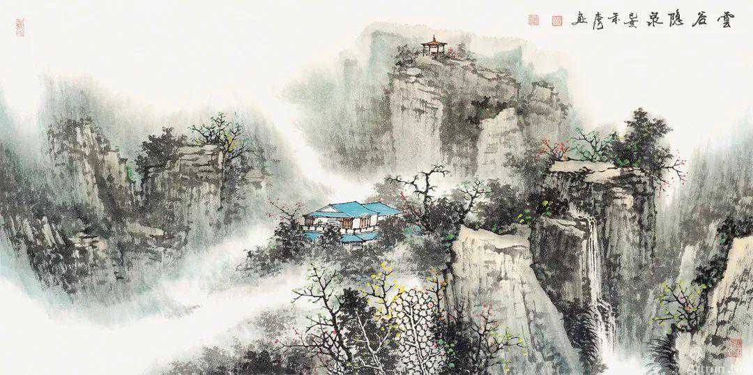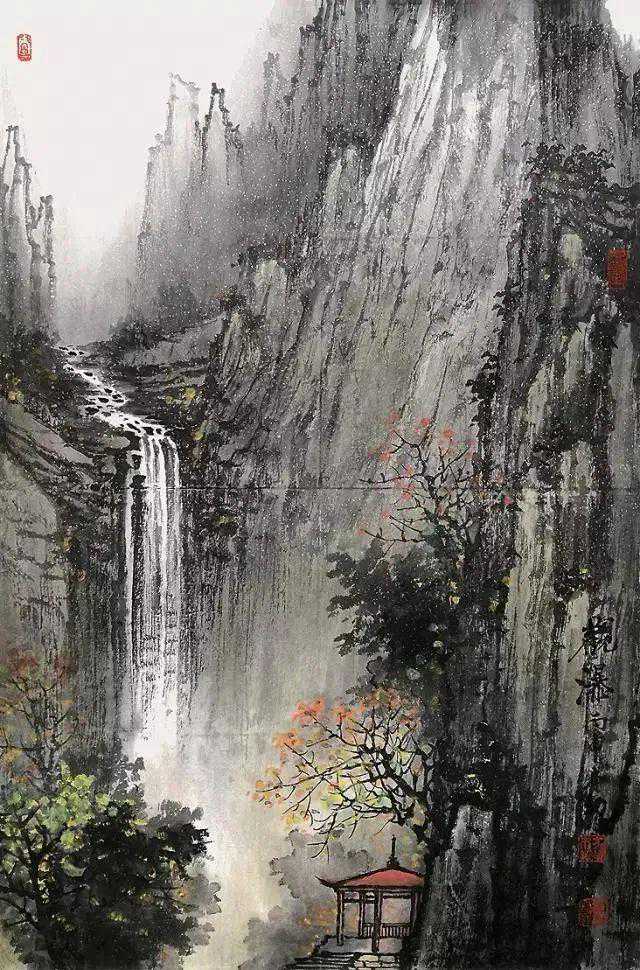 他擅山水,兼及花鸟。多年来独坐书斋,精研古法,传统功底宽实;广收博取,颖思奇构,风格独特清新。