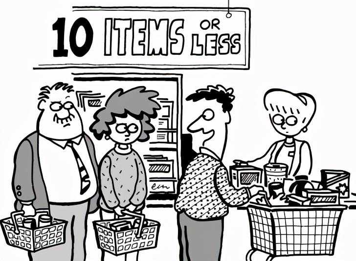 这两校一个以工科见长,一个以法商医闻名,所以当在超市里那种十件以下商品快速结账柜台,有个人推着一整车很明显超过10样东西去结账时,