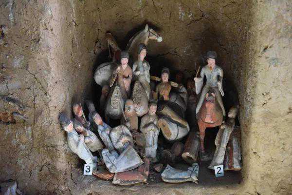 甬道及墓室内随葬有彩绘陶、漆木、石、铜、铁、金银器及革制和丝麻织品等,共计220余件组。其中陶器见有彩绘陶罐、素面双耳罐、陶盆及数量较多的彩绘人俑、骑马俑及狗、羊、鸡等家畜家禽俑,木器有彩绘天王俑、镇墓兽、武士俑、男女侍俑及带帷帐的床榻、门、胡床、马鞍、朱雀、玄武、羽人、凤鸟等,部分髹漆,见有漆盘、碗等。铜器见有铜锁、各构件上的铜饰、铜勺、筷及“开元通宝”铜钱。铁器见有铁甲胄。金银器主要为腰带饰、节约及革带饰。革制品主要为箭箙、腰带、方盒等。丝麻制品数量较多,主要覆盖于棺盖上、铺于棺床上及床榻帷帐上。甬道正中出土石质墓志一方。