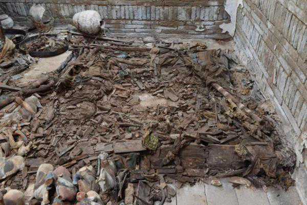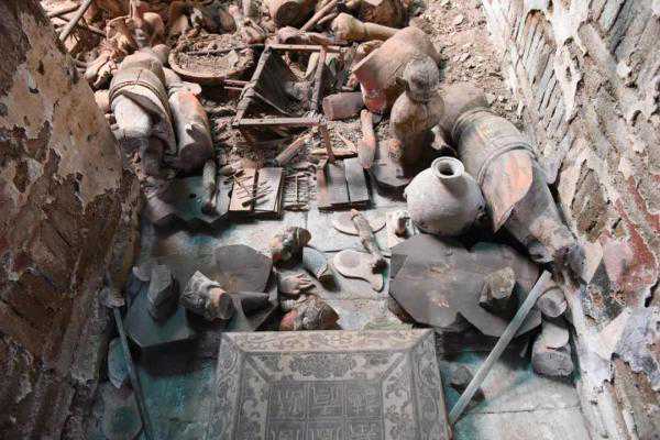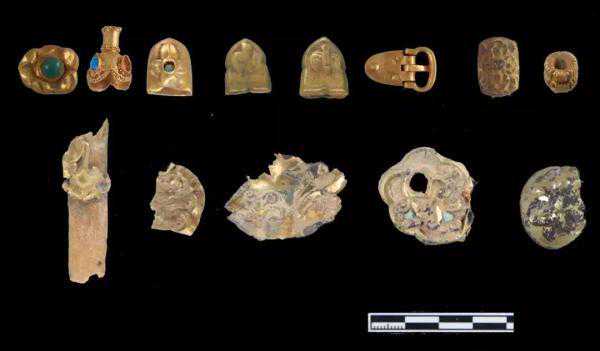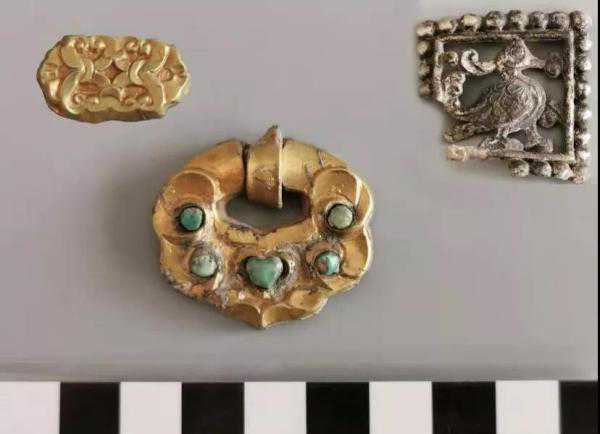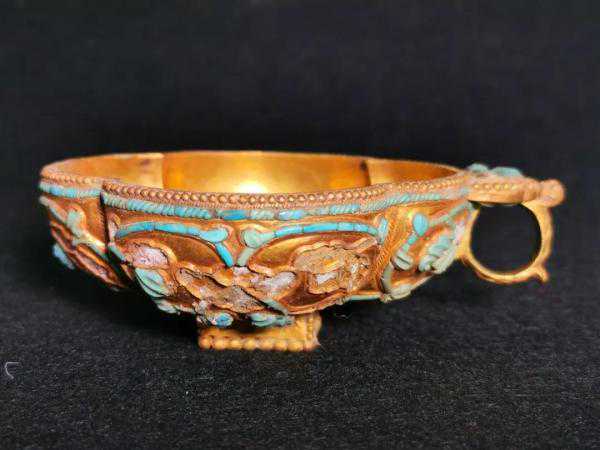 在后室西侧木椁外墓底坑壁上,发现一处封藏的暗格,内置一长方形木箱,箱内端放一件珍珠冕旒龙凤狮纹鎏金王冠和一件镶嵌绿松石四曲鋬指金杯,木箱下铺有粮食种子。鎏金王冠前后各饰一对翼龙,两侧各饰一立凤,后侧护颈饰双狮,周身镶嵌绿松石、蓝宝石、玻璃珠等,冠前檐缀以珍珠冕旒。供奉和珍藏的意味突出,可见是墓主人最为珍视的、兼具神圣性的重要物品。鋬指金杯有四曲杯体和方形圈足,装饰富丽,技艺精湛,融合唐朝、中亚和吐蕃之风于一体,以往出土的同类器物中无出其右者。