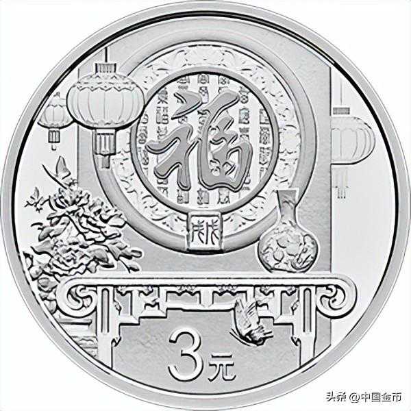 2016年贺岁银币的背面图案为乾隆手书“福”字造型,配以月亮门、蝙蝠、牡丹花等装饰图案组合设计,并刊面额。营造出“进门见福”的画面。