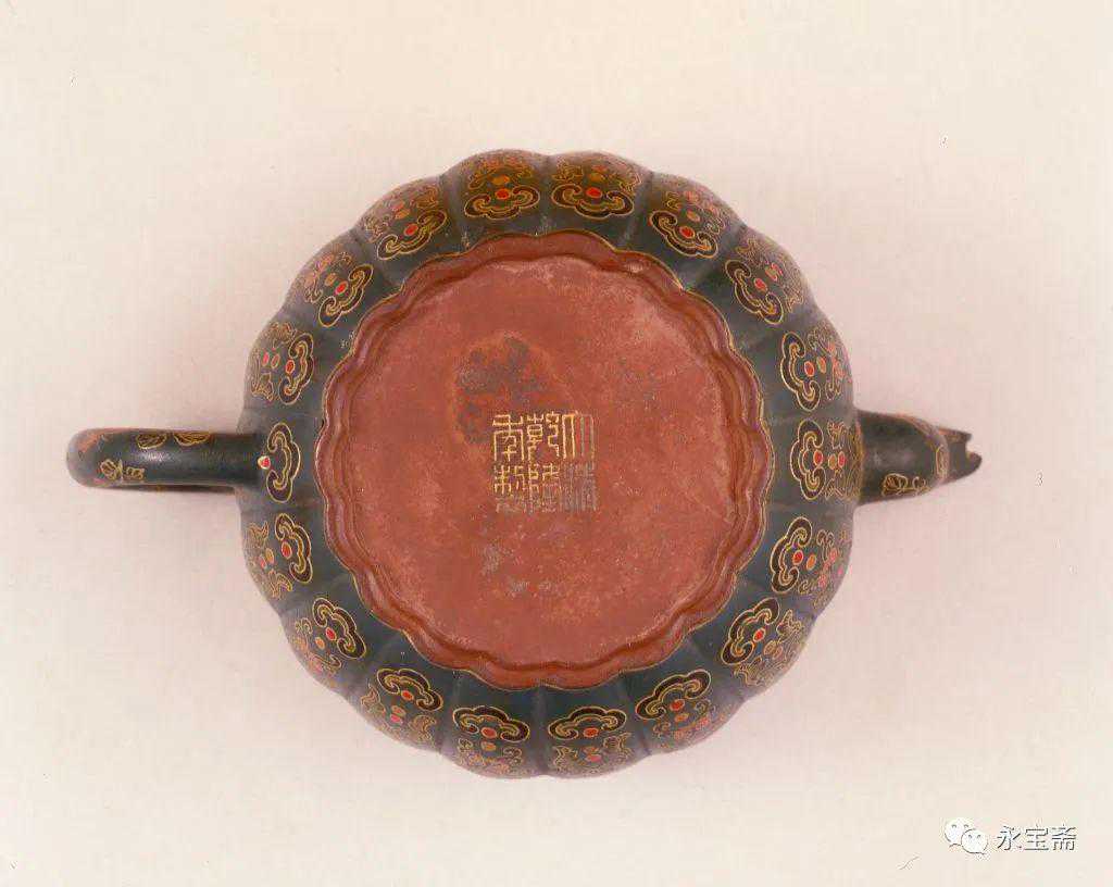 清乾隆宜兴窑紫砂胎绿地粉彩描金瓜棱执壶故宫博物院藏