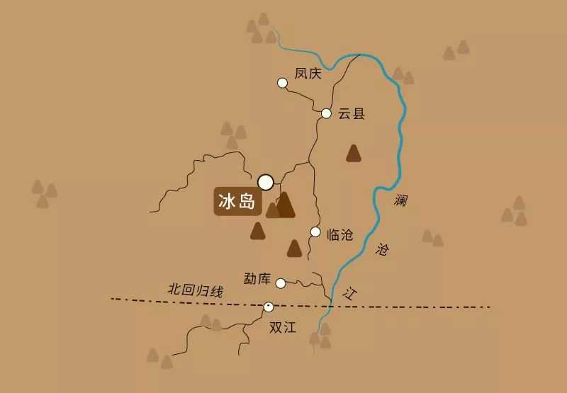冰岛位于北纬23度、东经99度,海拔大约1670米,属临沧茶区中的一颗璀璨之星。因茶汤汤感柔和、香气特殊,近几年来声名鹊起,大树茶的价格不菲。冰岛属于傣族的寨子,旧称“丙岛”或“扁岛”,傣语的意思是“用竹篱笆做寨门的地方”或“送青苔的地方”。它是勐库地区海拔最高的傣寨,森林覆盖面积大,茶树品种属于勐库大叶种,其村委会包括地界、南迫、冰岛、坝歪、糯伍五个村民小组。