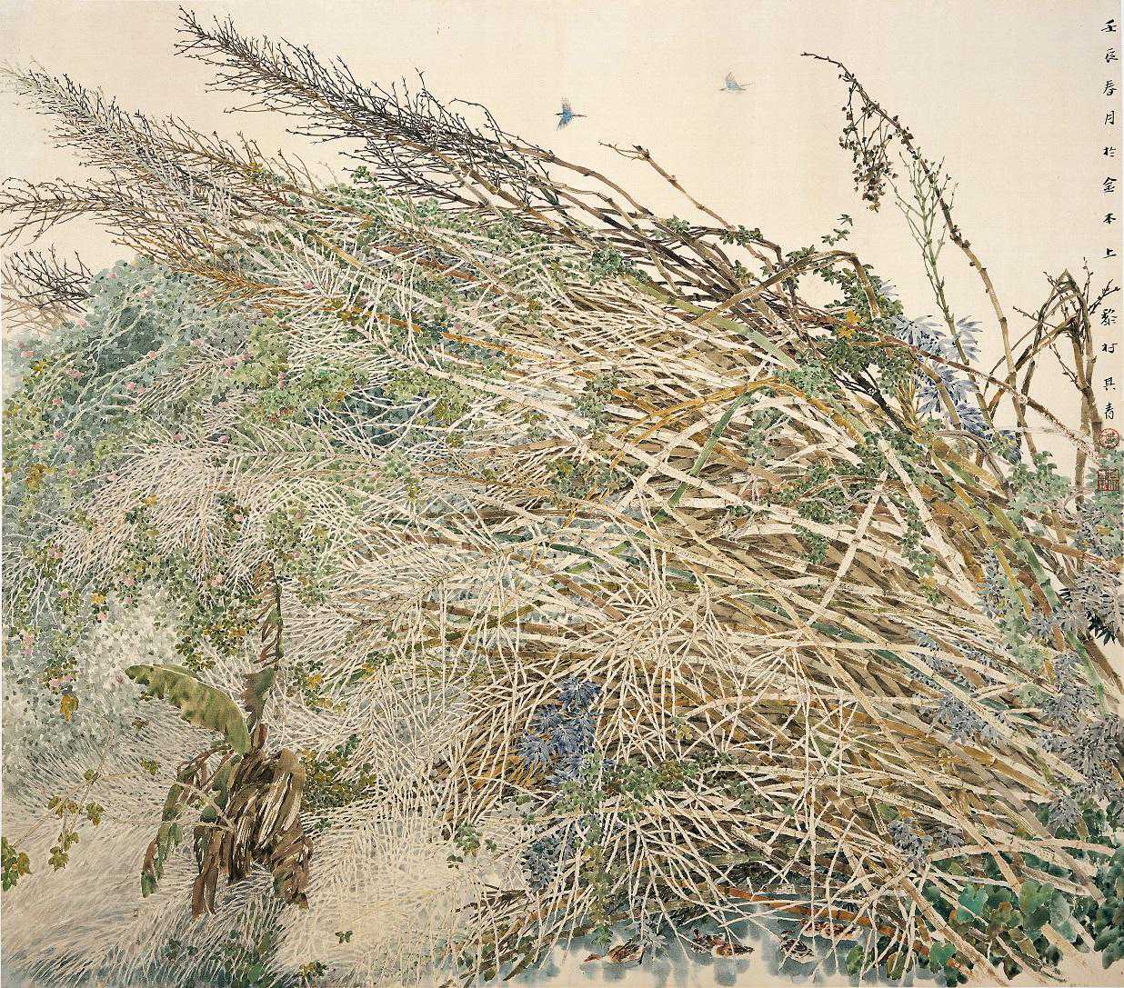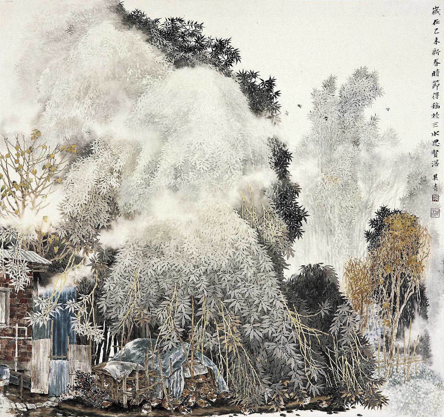 于他而言,画者最难之处就在于能产生令人动容的画外音,画一个皆知的题材,并能让人去留意和认同。在《春消息》、《藏龙》、《苍生》、《淡竹生凉意》、《风骨》、《金竹》、《蕉雨云泉图》、《绿屏吟》、《清炊》等作品中,能感受到他与中国古代田园画家和诗人把田园作为抒情明志的对象和人生旅程中的精神家园是一致的,画面静穆和谐而又不失“人间烟火”的生气与活力。