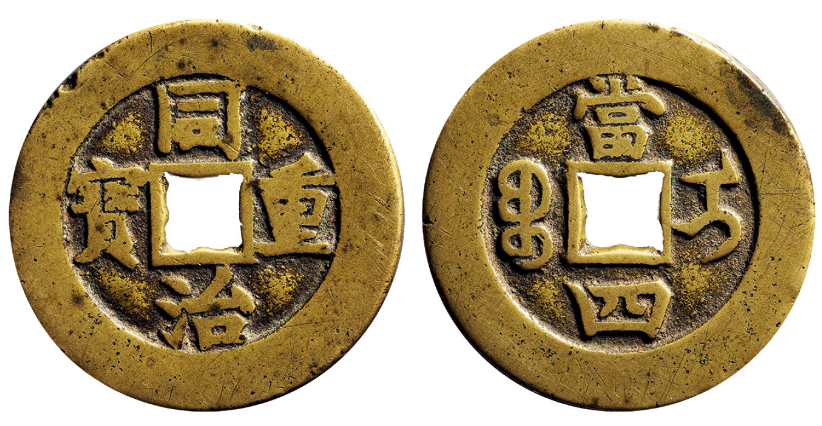 尤其是在新疆红钱里,黄铜的部颁样钱除了道光阿克苏黄铜的平钱以外,其他的几乎难得一见!再给大家看一看普通的同治重宝宝伊当四是什么样子的。