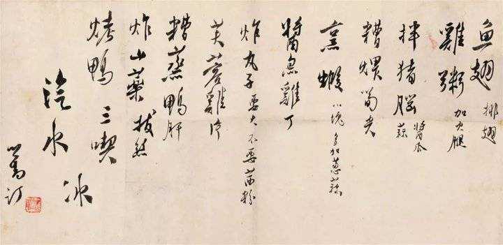 民国书画界收藏界的名流多爱美食,大画家张大千、溥心都以“好吃”闻名艺坛。张大千宴请朋友,多以川菜为主,有时亲自下厨。经常高兴地将宴请的菜品、主副宾客等写成菜单,注明日期赠予好友以做留念。