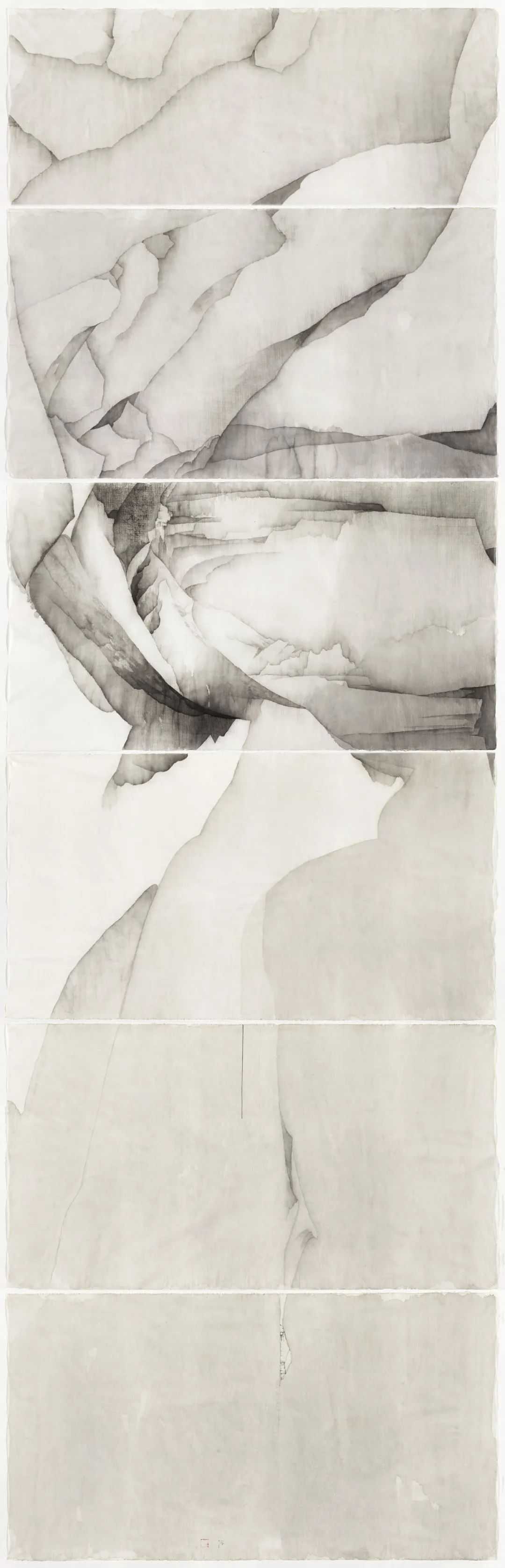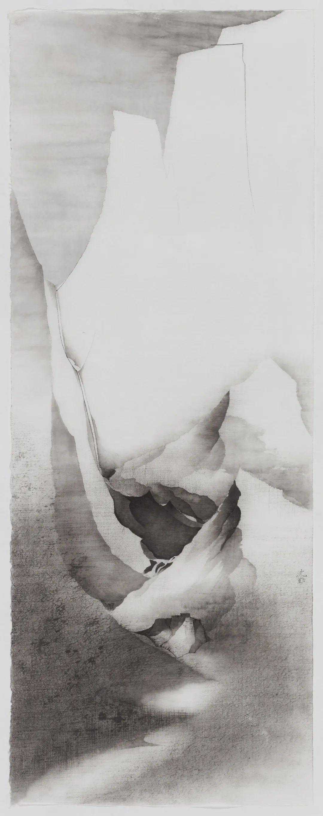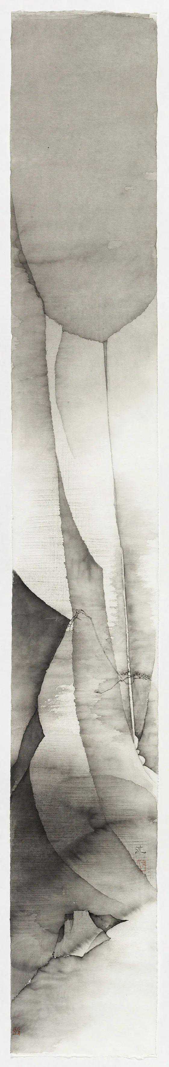虽说艺术家拥有卓越的控制力,但生宣上的不可控的变化才是最激动人心的时刻,也是水墨画最吸引人的地方。所谓掌控,全在于画家及时发现画面中随机出现的变化,一些灵感瞬间,成就一幅精彩的作品。新作中的几张大尺幅山水里,某种新变化悄然发生。