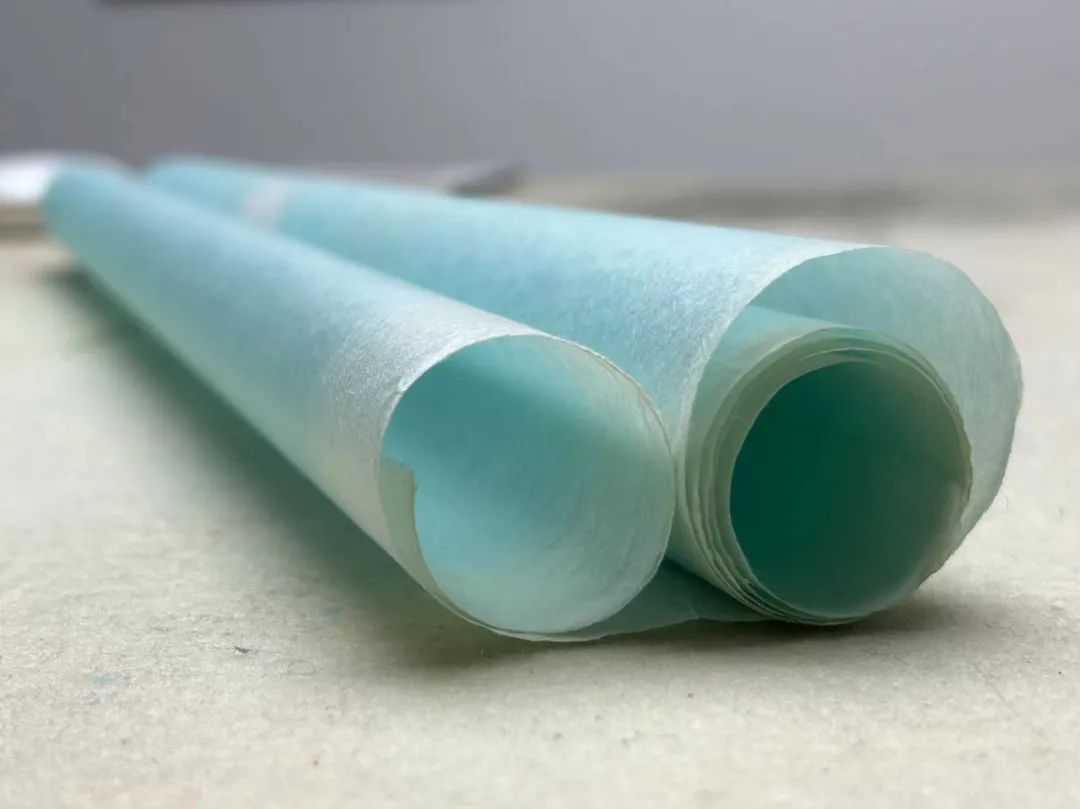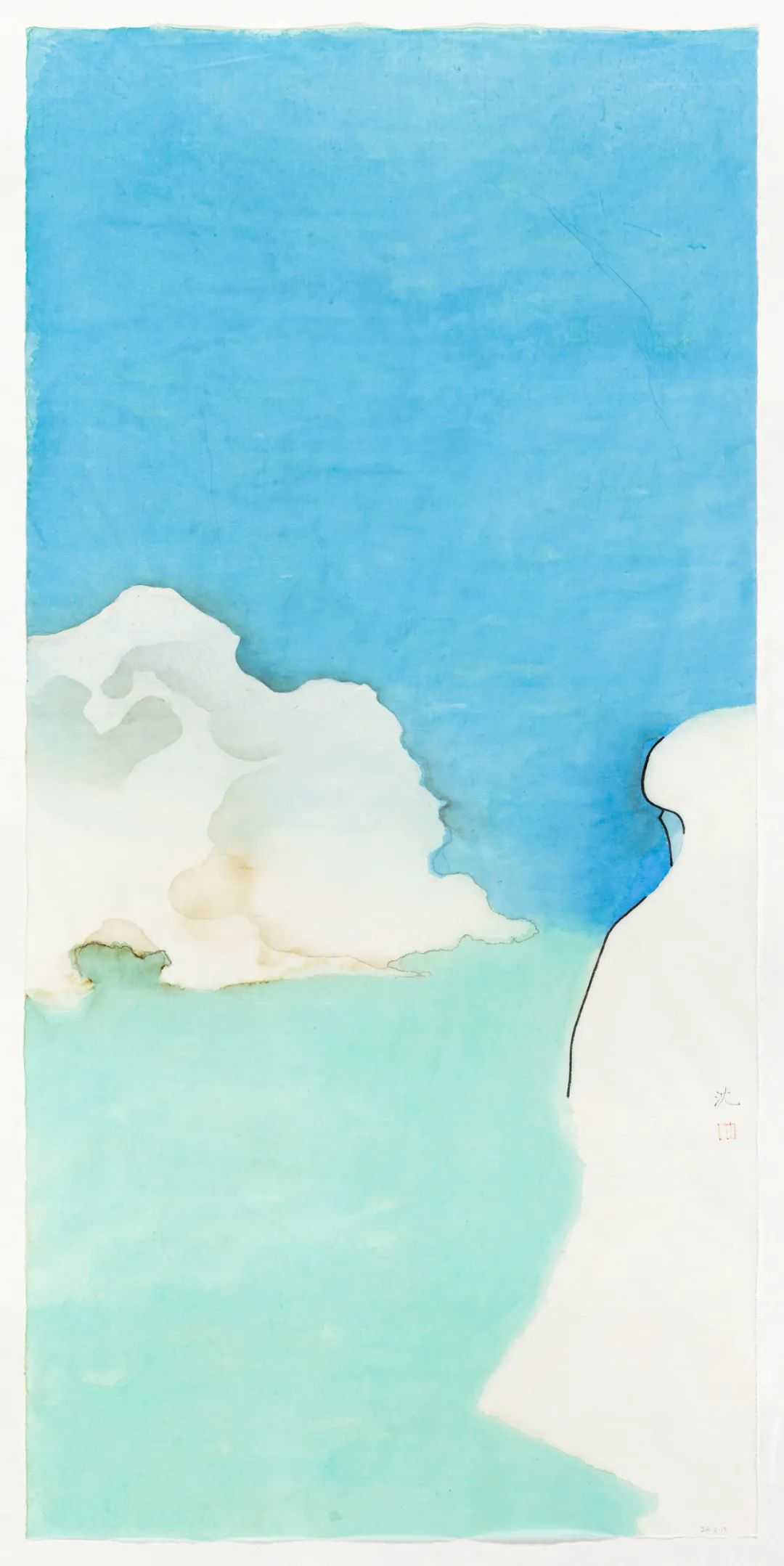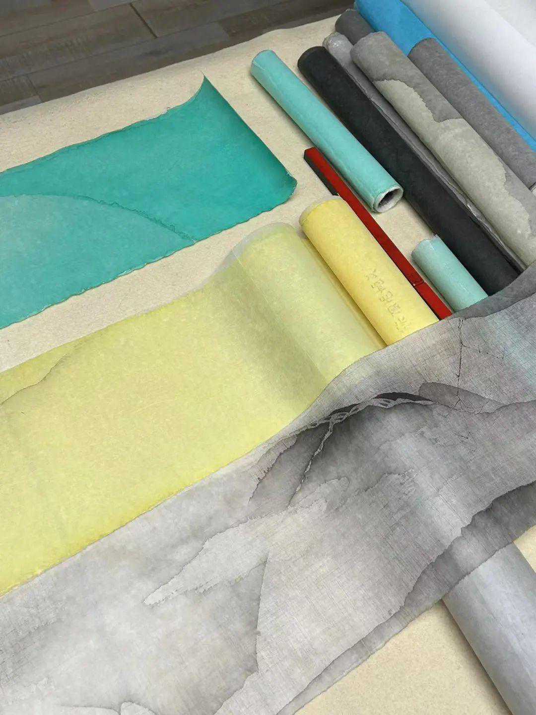 另一方面,做“减法”意图也表现在新作的形式上,展厅中最引人瞩目的莫过于一幅无装裱,轻盈悬挂在展厅中的石绿山水画。沈勤表示,他本就不喜欢装裱:“宣纸一托,纸墨被全堵死。我还是喜欢纸原本的呼吸、透气的舒畅感。这几年我还自己开发了纱布托法,也可以通透,但毕竟不如不托那么纯粹。”